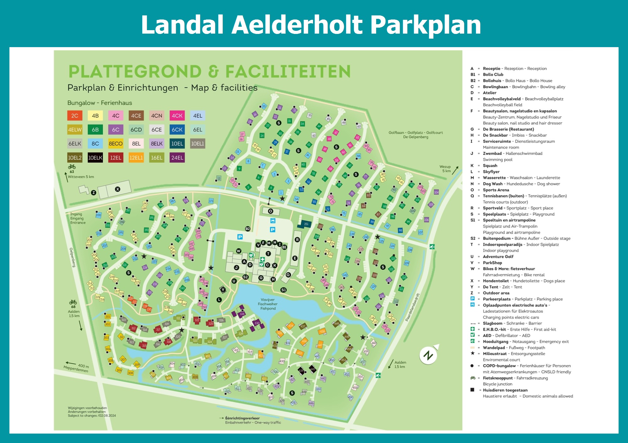 Aktueller und übersichtlicher Parkplan von Landal Aelderholt mit alle Unterkünfte und Einrichtungen, auch als PDF herunterladbar.