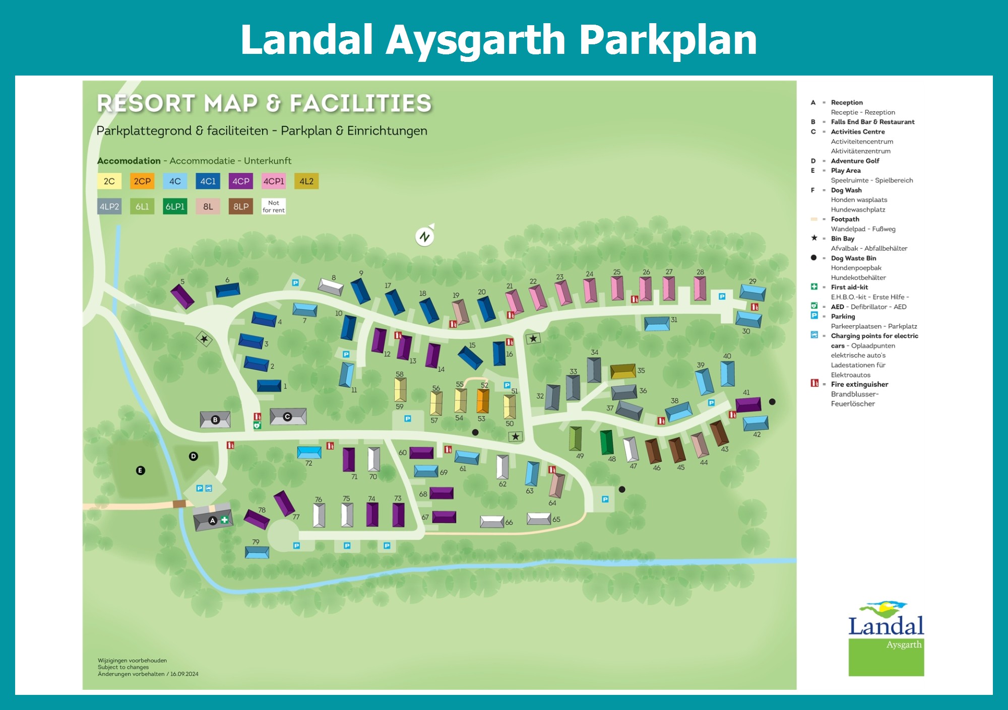 Aktueller und übersichtlicher Parkplan von Landal Aysgarth mit alle Unterkünfte und Einrichtungen, auch als PDF herunterladbar.