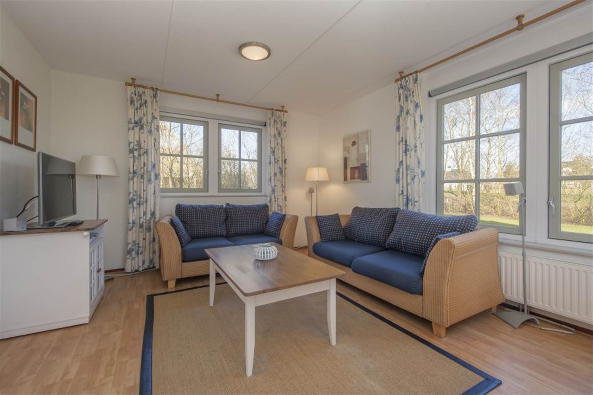 Erdgeschoss: Eingang mit Flur und Toilette. Wohnzimmer mit Sitz- und Essecke, offene Küche und aufschlagende Türen zur Terrasse mit Gartenmöbeln. Ein Schlafzimmer mit zwei Einzelbetten. Badezimmer mit Waschtisch, Dusche und Badewanne.