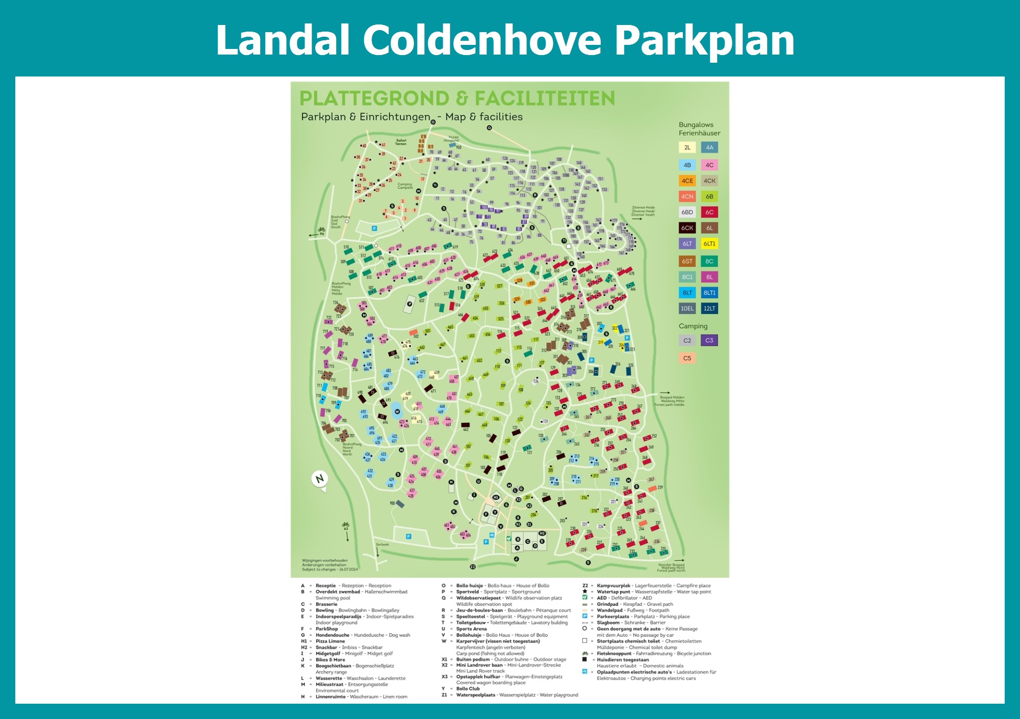 Aktueller und übersichtlicher Parkplan von Landal Coldenhove mit alle Unterkünfte und Einrichtungen, auch als PDF herunterladbar.