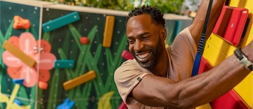 Erklimme die 8 Meter hohe Kletterwand in der Indoor-Aktivitätenhalle Action Factory. Mit unterschiedlichen Klettertouren, die sich für Kinder und Erwachsene eignen.