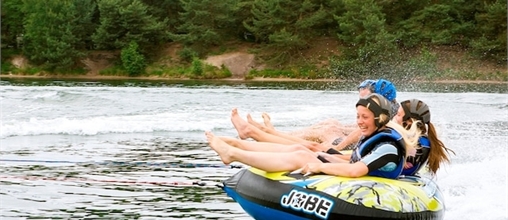 Der große See bietet viel Wasserspaß. Zum Beispiel auf einem Tube: einem großen Reifen, der von einem Jetski gezogen wird. Es gibt Platz für 4 Personen. Halten Sie sich gut fest - aber ins Wasser zu fallen macht auch Spaß.