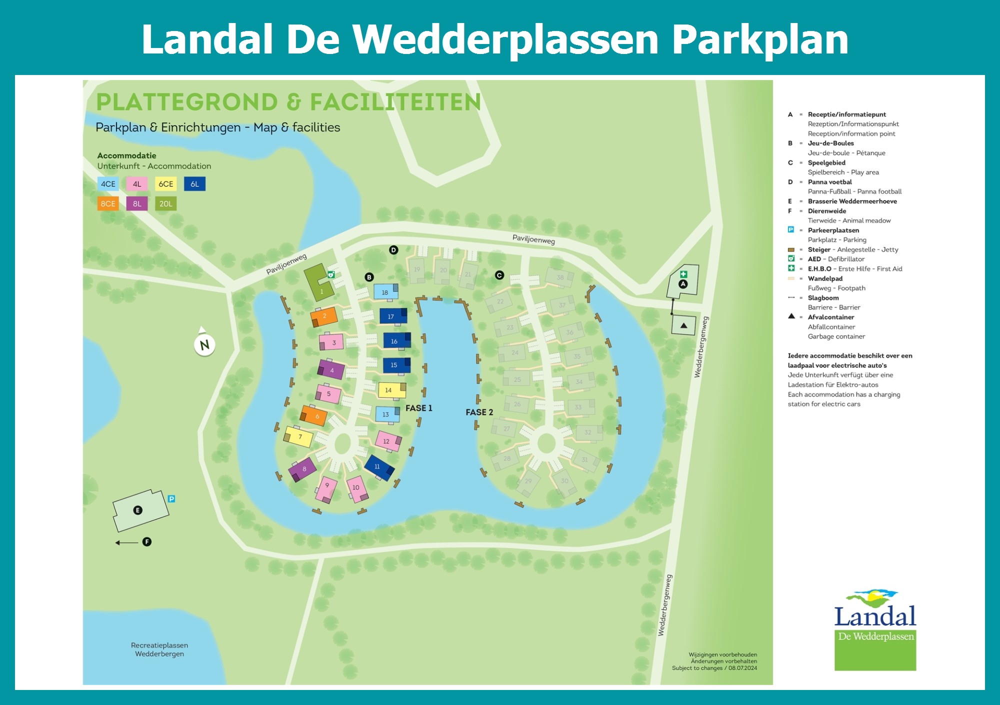 Aktueller und übersichtlicher Parkplan von Landal De Wedderplassen mit alle Unterkünfte und Einrichtungen, auch als PDF herunterladbar.