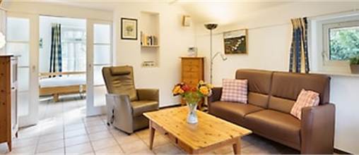 Erdgeschoss: Eingang mit Flur und Toilette. Komplett rollstuhlgerechtes Erdgeschoss. Großer Wohnraum mit Sitz- und Essecke und u. a. elektrisch verstellbarem luxuriösen Sessel und CD-Player. Offene Küche mit Kombi-Mikrowelle, Kaffeemaschine und Geschirrspüler. Schlafzimmer mit elektrisch verstellbarem Bett mit Haltegriff und Bettgitter sowie eine elektrische Klingel zum Schlafzimmer oben. Badezimmer mit Waschtisch und Dusche mit separatem Duschstuhl und Toilette mit Haltegriffen. Terrasse mit Gartenmöbeln. Separater Abstellraum. Die Unterkunft verfügt über eine Waschmaschine