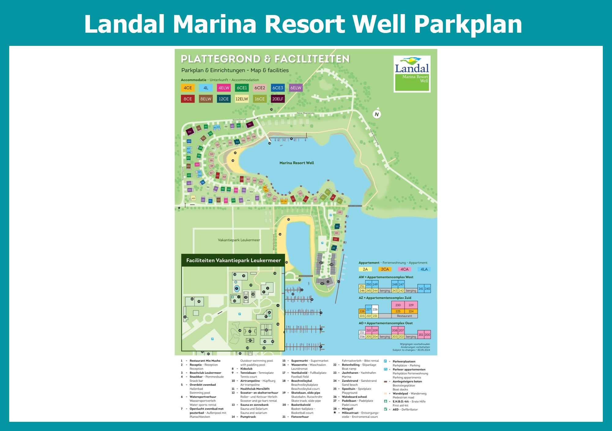 Aktueller und übersichtlicher Parkplan von Landal Marina Resort Well mit alle Unterkünfte und Einrichtungen, auch als PDF herunterladbar.
