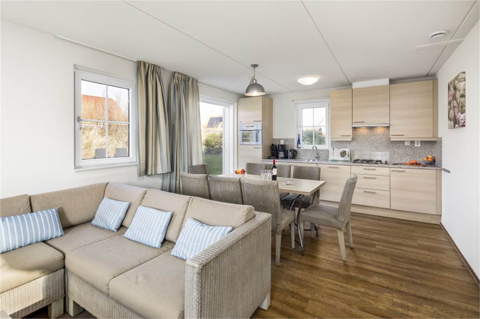 Diese luxuriöse freistehende Villa eignet sich für 8 Personen. Über den Flur erreichen Sie das helle Wohnzimmer mit Fußbodenheizung und Flügeltüren zur beheizten Terrasse. Eine vollständig eingerichtete Küche mit Geschirrspüler, Kombi-Mikrowelle und Kühl-/Gefrierkombination und eine separate Toilette und ein Abstellraum sowie ein Schlafzimmer mit TV und Badezimmer befindet sich im Erdgeschoss. Die Nutzung von WiFi ist gratis. Im Obergeschoss befinden sich drei Schlafzimmer, ein Badezimmer mit Dusche und Indrarotsauna und eine separate Toilette. Wenn Sie Fahrräder mit in den Urlaub bringen, können Sie diese im Fahrradschuppen unterstellen.