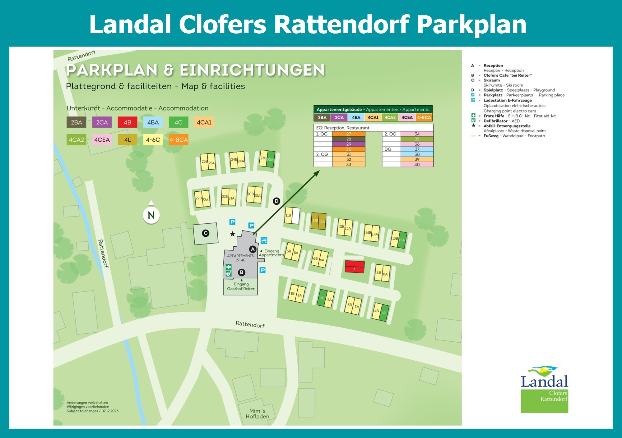 Aktueller und übersichtlicher Parkplan von Landal Clofers Rattendorf mit alle Unterkünfte und Einrichtungen, auch als PDF herunterladbar.