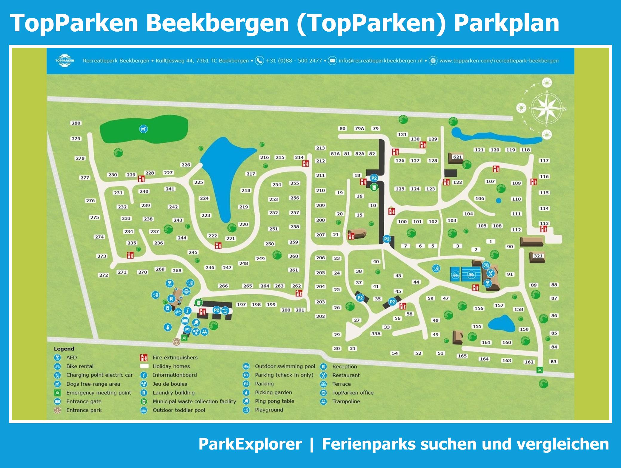 Aktueller und übersichtlicher Parkplan von TopParken Beekbergen mit alle Unterkünfte und Einrichtungen, auch als PDF herunterladbar.