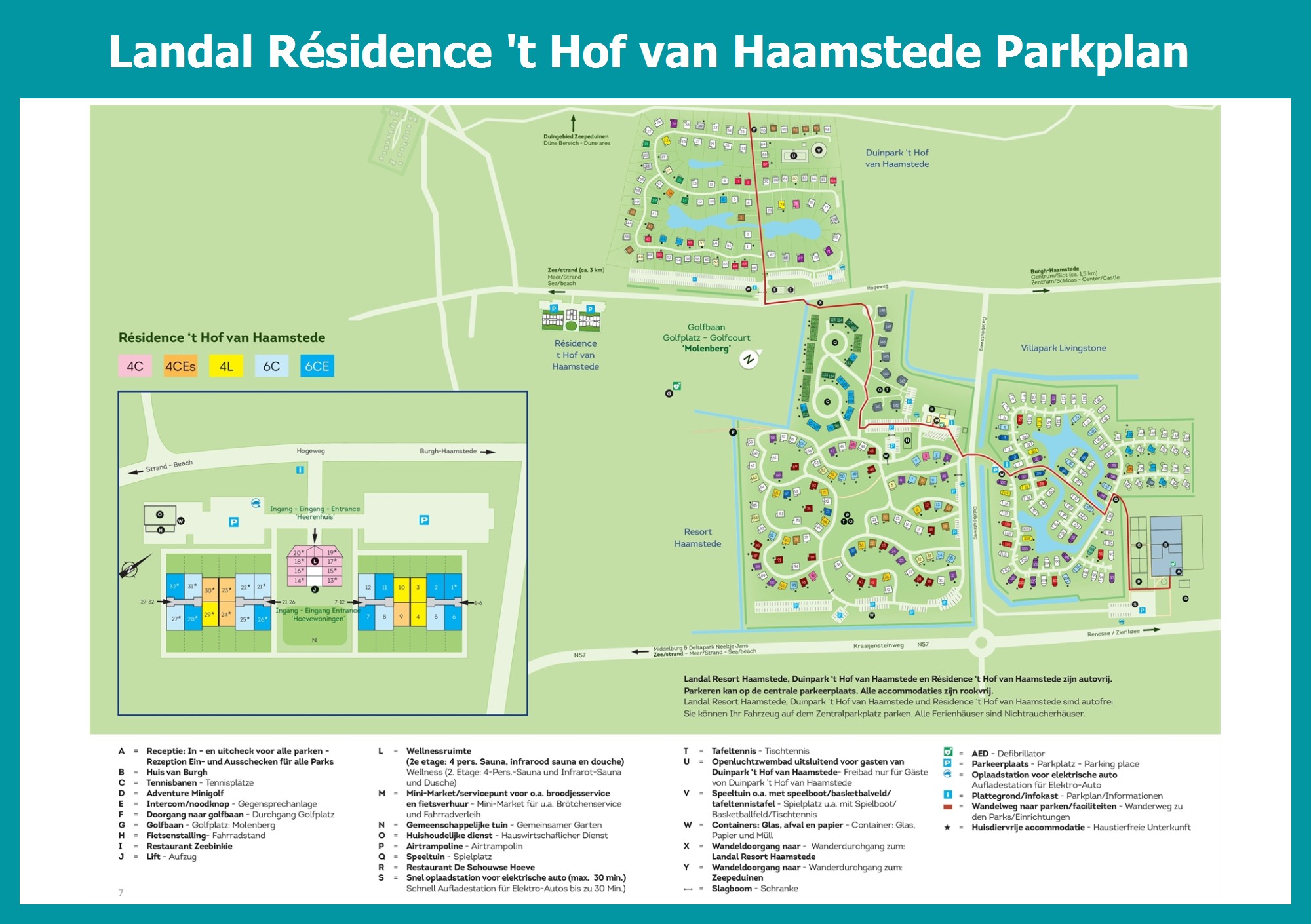 Aktueller und übersichtlicher Parkplan von Landal Résidence 't Hof van Haamstede mit alle Unterkünfte und Einrichtungen, auch als PDF herunterladbar.