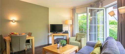 Schlafzimmer mit einem Boxspring-Doppelbett, 2-Personen Softtopper und Flatscreen-TV