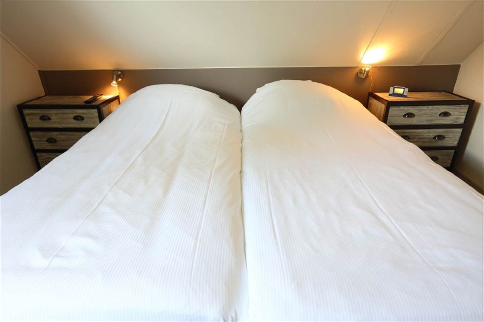 Schlafzimmer: Dieser Unterkunftstyp bietet zwei Schlafzimmer im ersten Obergeschoss. Alle Schlafzimmer sind mit Einzel-Boxspringbetten eingerichtet. Eins der Schlafzimmer im Obergeschoss bietet Zugang zum Balkon.
