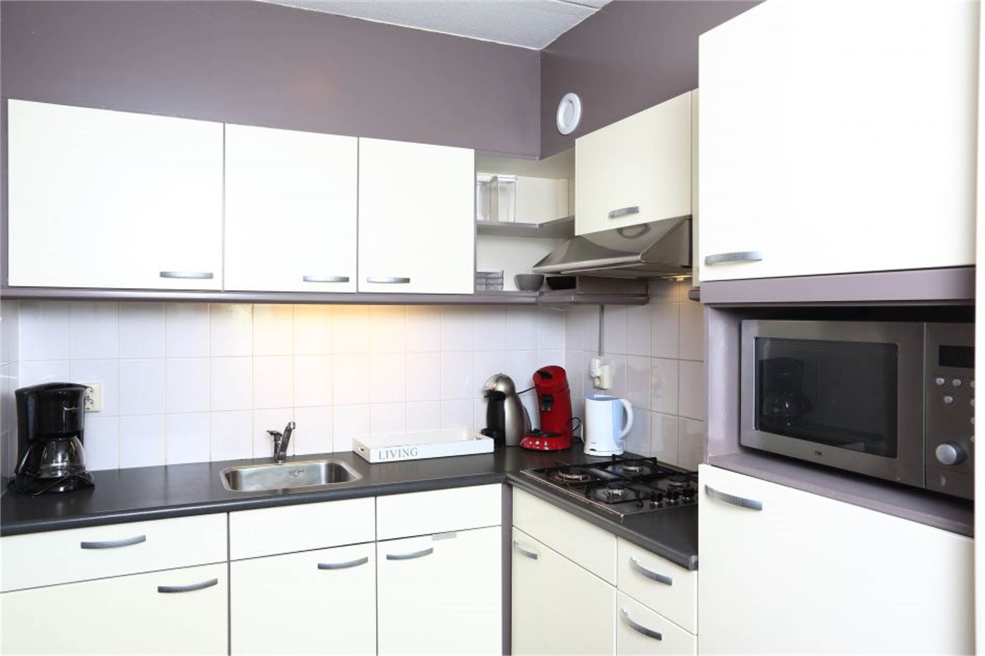 Erdgeschoss: Wohnzimmer mit TV-Gerät mit deutschen Sendern. Offene Küche mit Backofen, Geschirrspüler, Kühlschrank mit Gefrierfach, Kaffeemaschine und Wasserkocher. Badezimmer mit (begehbarer) Regendusche. Separate Toilette.