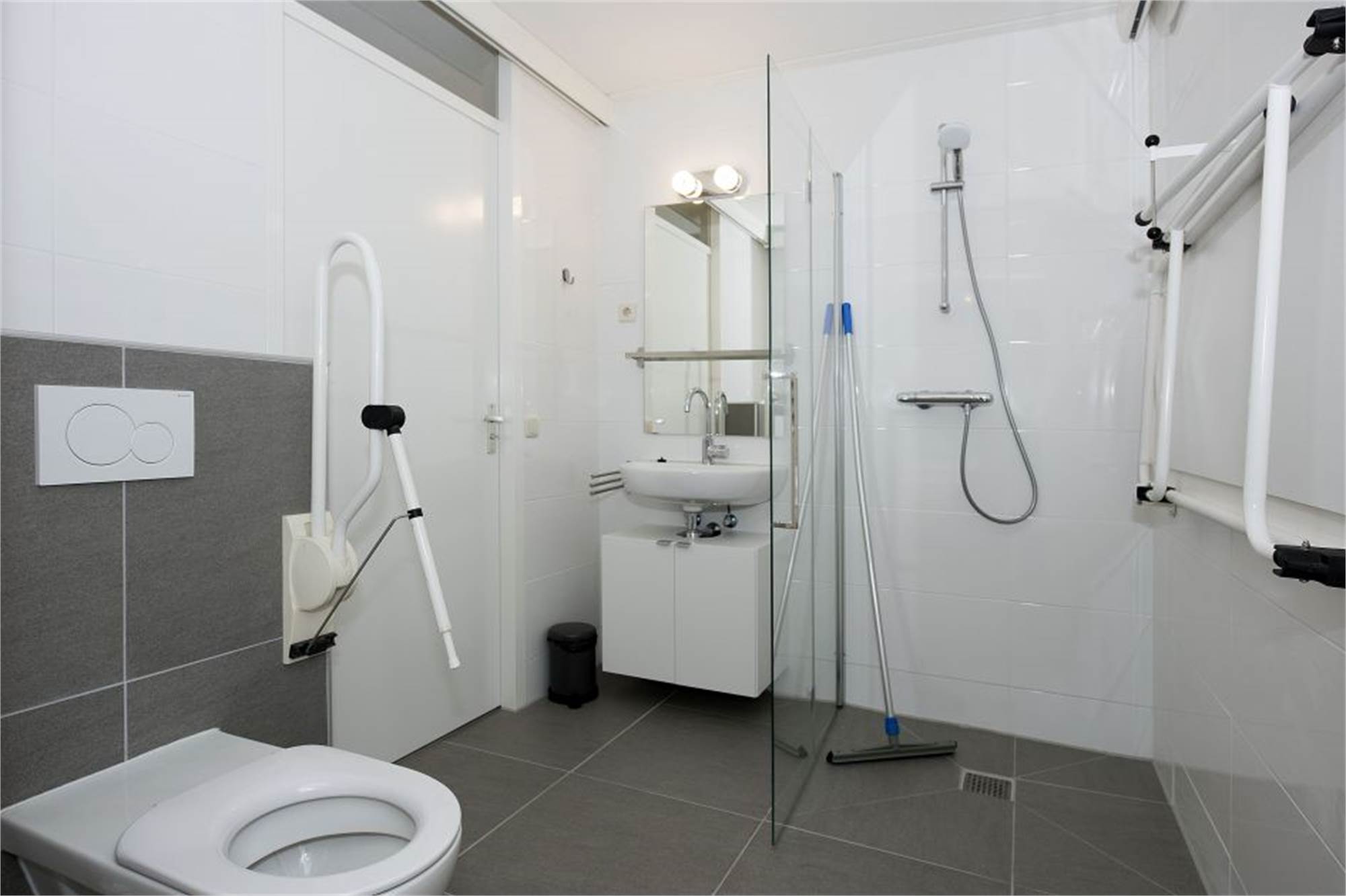 Besonders praktisch: Dieser Bungalow ist auf die Bedürfnisse von Körperbehinderten zugeschnitten und weist die folgenden behindertengerechten Besonderheiten auf: Türen mit einer Breite von mindestens 90 cm, eine Vordertür und eine Terrasse mit einer minimalen Türschwelle, ein barrierefreies und rollstuhlgerechtes Erdgeschoss, ein Badezimmer mit Hublift und Stützen im Toilettenbereich und einem separaten Duschstuhl.