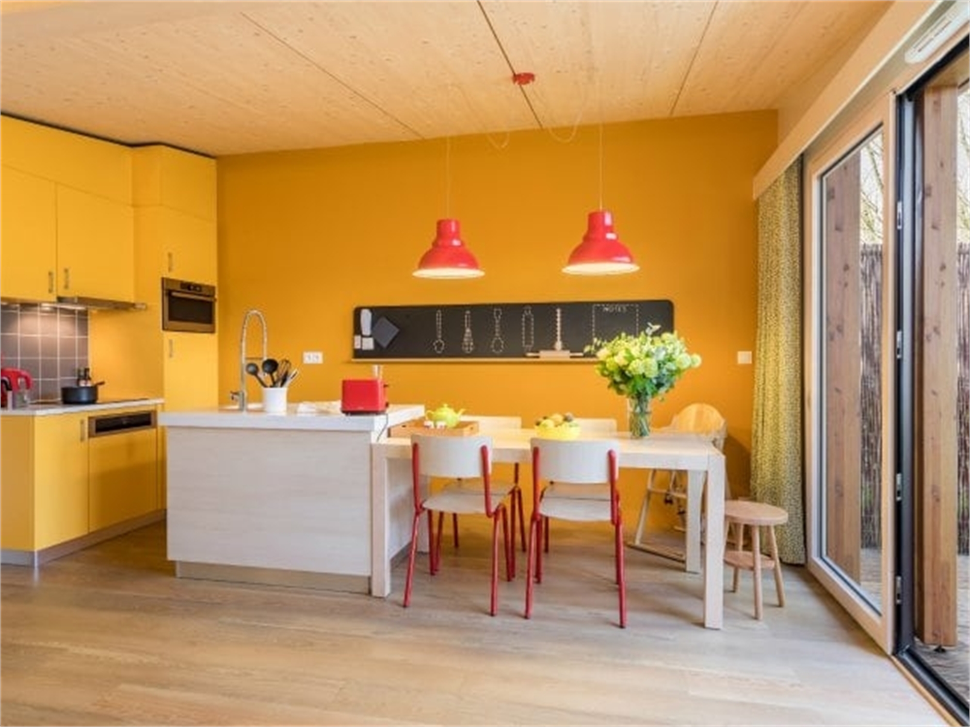 Wohnzimmer mit Flachbild-Fernseher. Große bodentiefe Fenster mit Blick auf die Holzterrasse, ausgestattet mit Gartenmöbeln