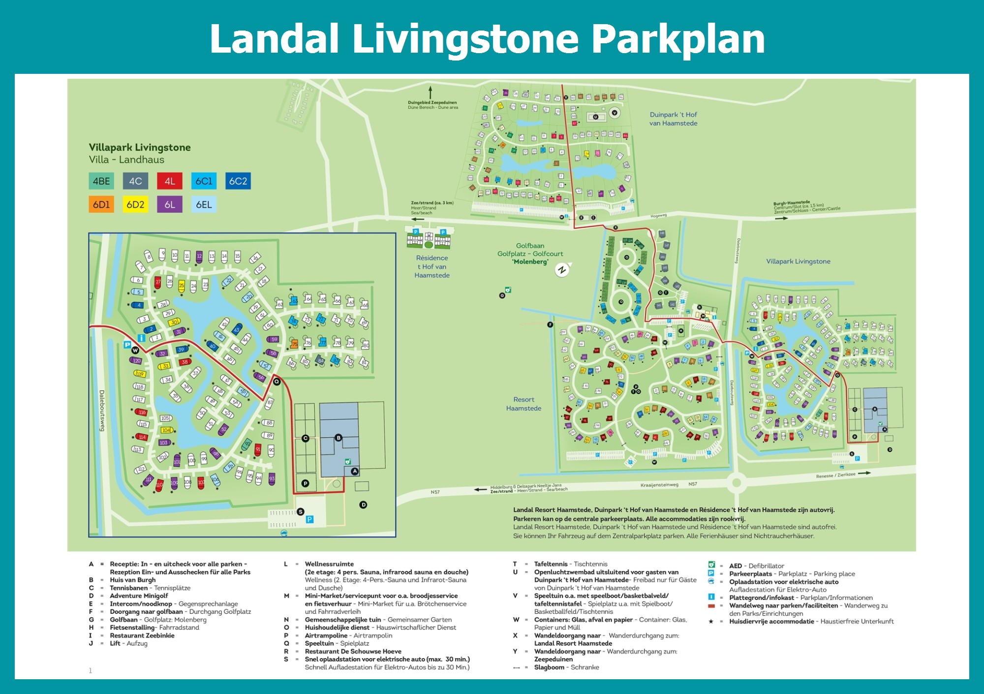 Aktueller und übersichtlicher Parkplan von Landal Livingstone mit alle Unterkünfte und Einrichtungen, auch als PDF herunterladbar.