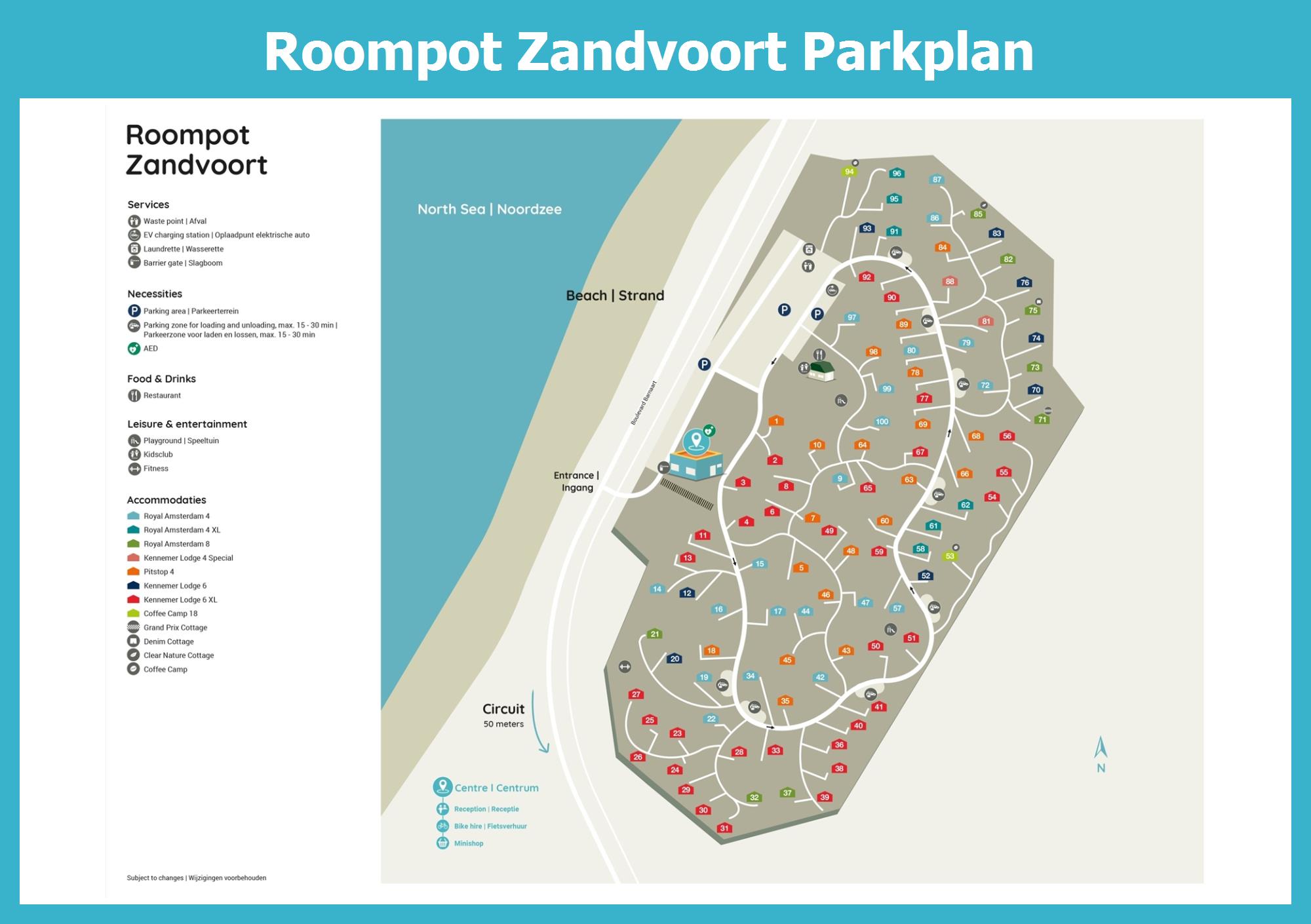 Aktueller und übersichtlicher Parkplan von Roompot Zandvoort mit alle Unterkünfte und Einrichtungen, auch als PDF herunterladbar.