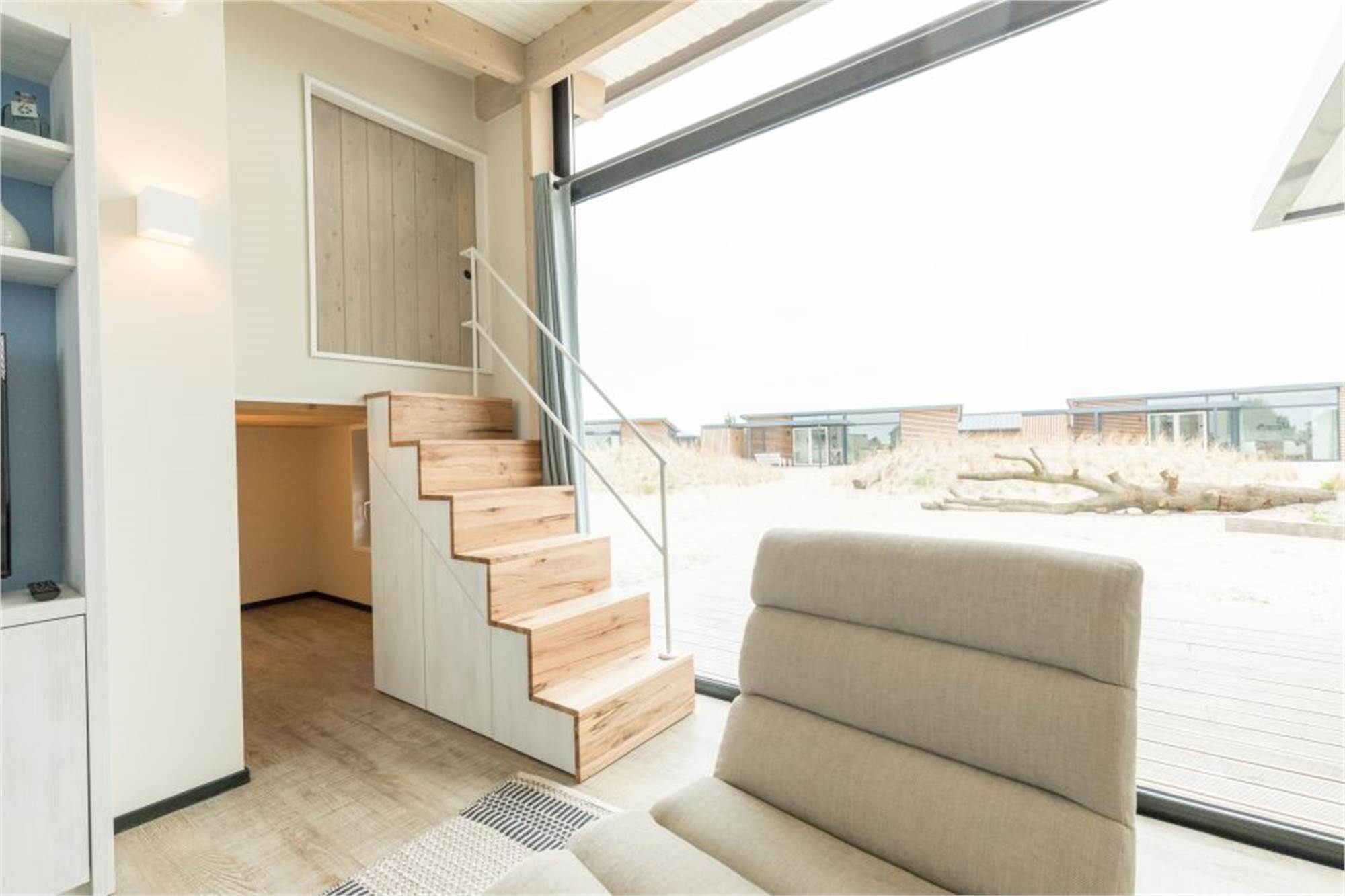 Ce lodge indépendant peut accueillir 6 personnes. La salle de séjour a un coin salon, une smart-TV et un coin repas. La cuisine est équipée d'un lave-vaisselle, d'un réfrigérateur avec compartiment congélateur, d'un micro-ondes combiné, d'une machine à café dosettes et d'une bouilloire. Il y a 2 chambres à coucher, 1 avec 2 lits simples et 1 avec un lit superposé. Par un escalier en bois, vous atteignez la mezzanine avec 2 autres lits. La salle de bains se compose de toilettes, d'un lavabo et d'une douche à l'italienne. Le lodge dispose d'un jardin avec pergola et un ensemble lounge. Tout le lodge est équipé du chauffage au sol et du wifi gratuit.