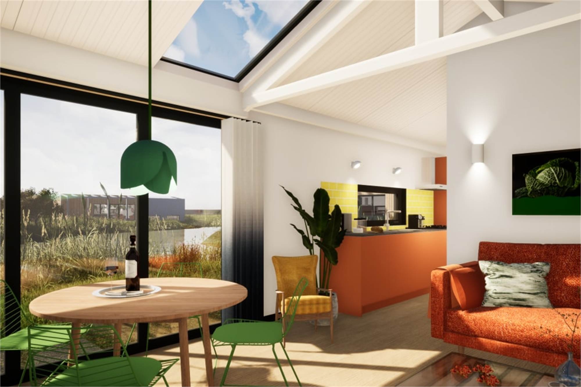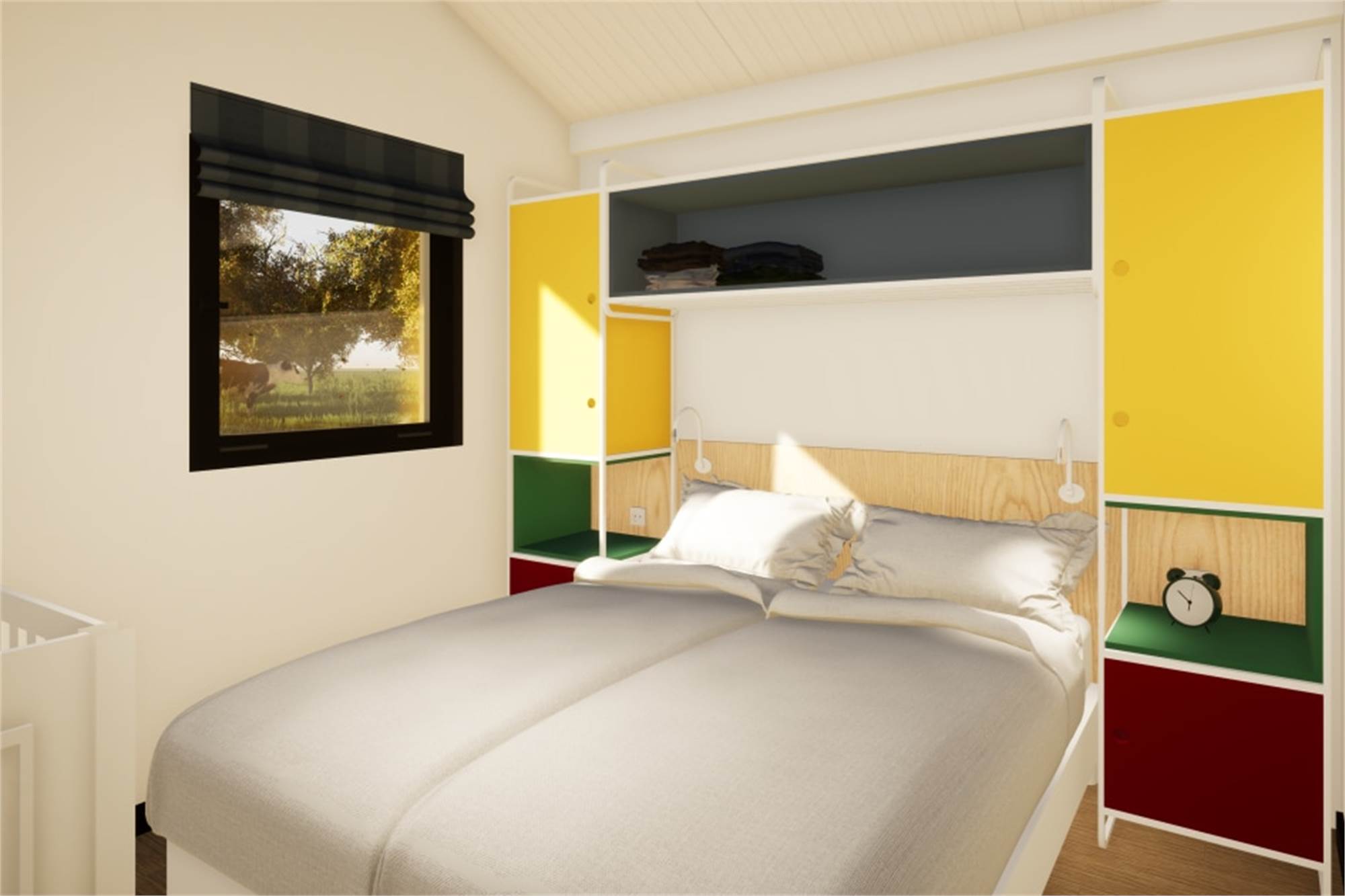 Ce lodge indépendant peut accueillir 4 personnes. La salle de séjour a un coin salon, une smart-TV et un coin repas. La cuisine est équipée d'un lave-vaisselle, d'un réfrigérateur avec compartiment congélateur, d'un micro-ondes, d'une machine à café et d'une bouilloire. Il y a 2 chambres à coucher, chacune avec 2 lits simples. La chambre à coucher permet d'accueillir un lit d'enfant supplémentaire. La salle de bains se compose d'un lavabo et d'une douche à l'italienne. Il y a également des toilettes séparées. Le lodge dispose d'un jardin avec pergola et un ensemble lounge. Tout le lodge est équipé du chauffage au sol et du wifi gratuit.