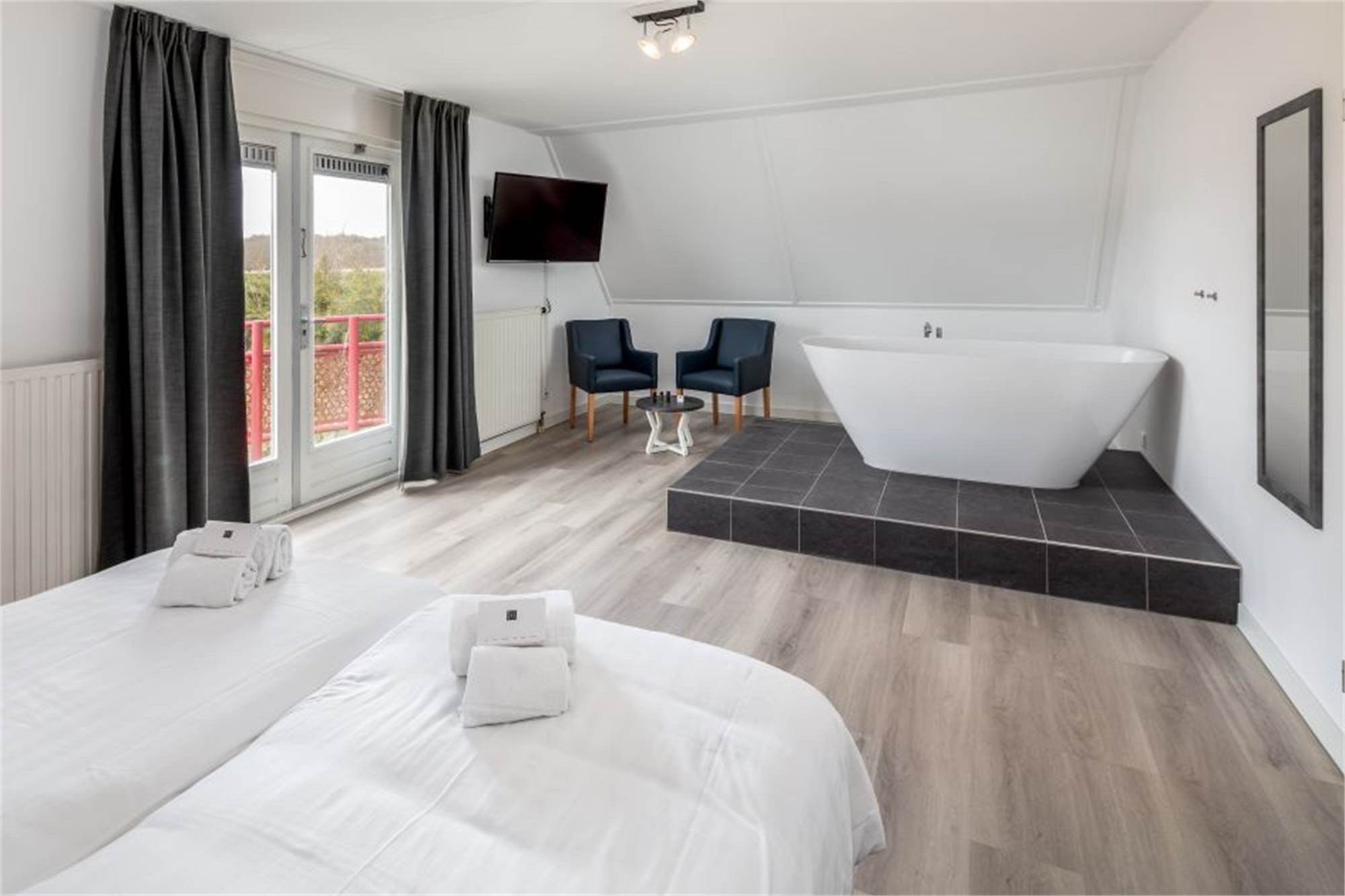 Ce bungalow indépendant peut accueillir 6 personnes. La salle de séjour spacieuse dispose d'un coin salon équipé d'une télévision connectée. Dans la cuisine ouverte, vous trouverez une machine à café à dosettes et un four micro-ondes combiné. L'une des chambres se trouve au rez-de-chaussée et les 2 autres sont à l'étage. Une de ces chambres dispose d'un balcon privé et toutes les chambres sont meublées de lits simples avec sommiers à ressorts. Dans la salle de bains au premier étage, vous trouverez une baignoire, une douche à l'italienne et des toilettes séparées. Le jardin est clôturé et dispose d'une terrasse avec ameublement lounge. Le bungalow est également équipé d'un sauna infrarouge.