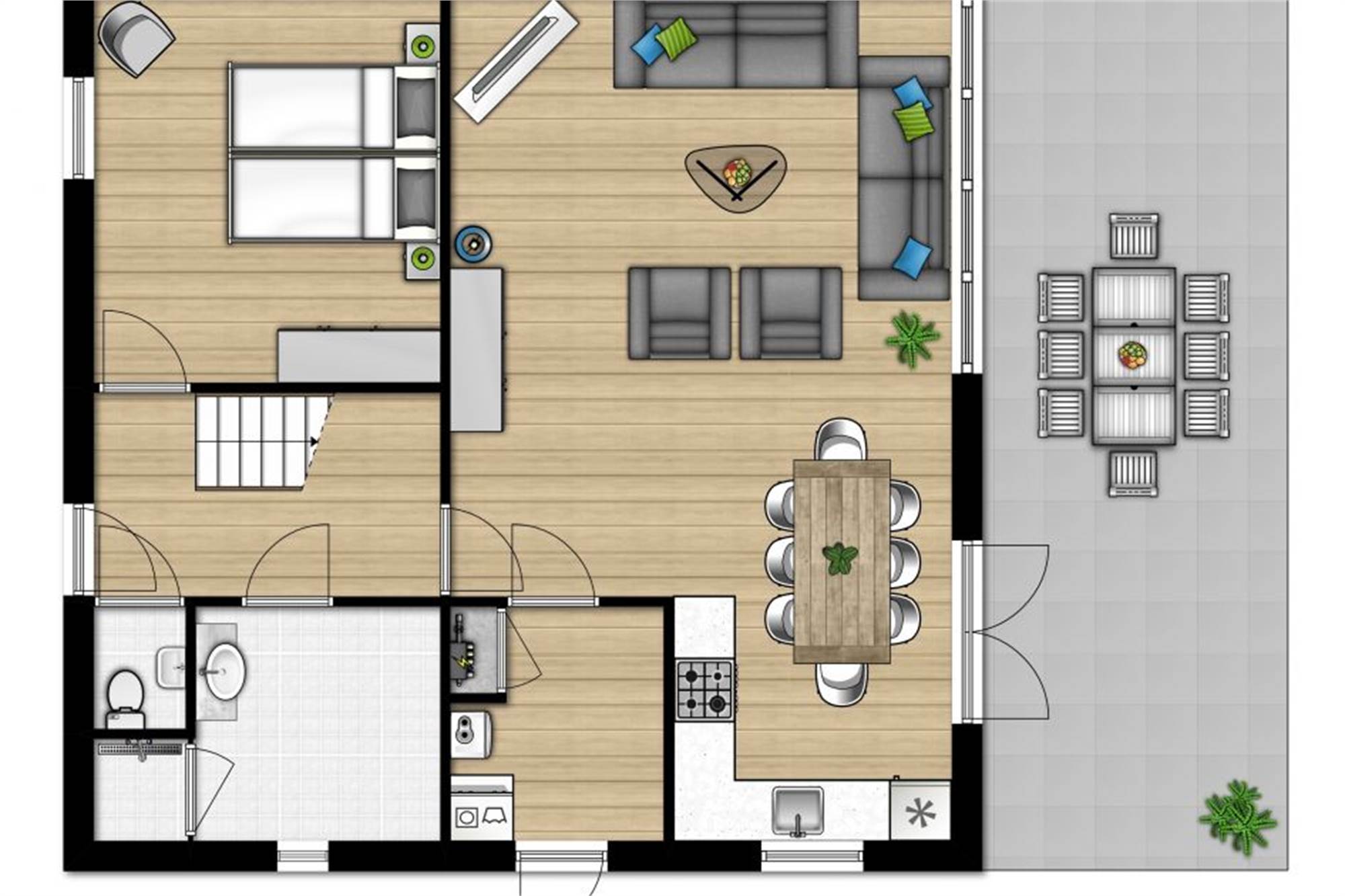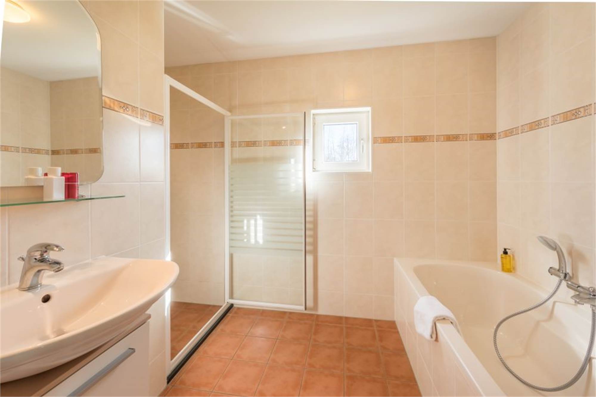 Rez-de-chaussée: séjour spacieux, cuisine ouverte avec coin repas, four micro-ondes et lave-vaisselle, une chambre double, une buanderie avec lave-linge et sèche-linge, salle de bains spacieuse avec douche, toilettes séparées. Baignoire à réserver avec préférence. Terrasse au soleil avec mobilier de jardin.