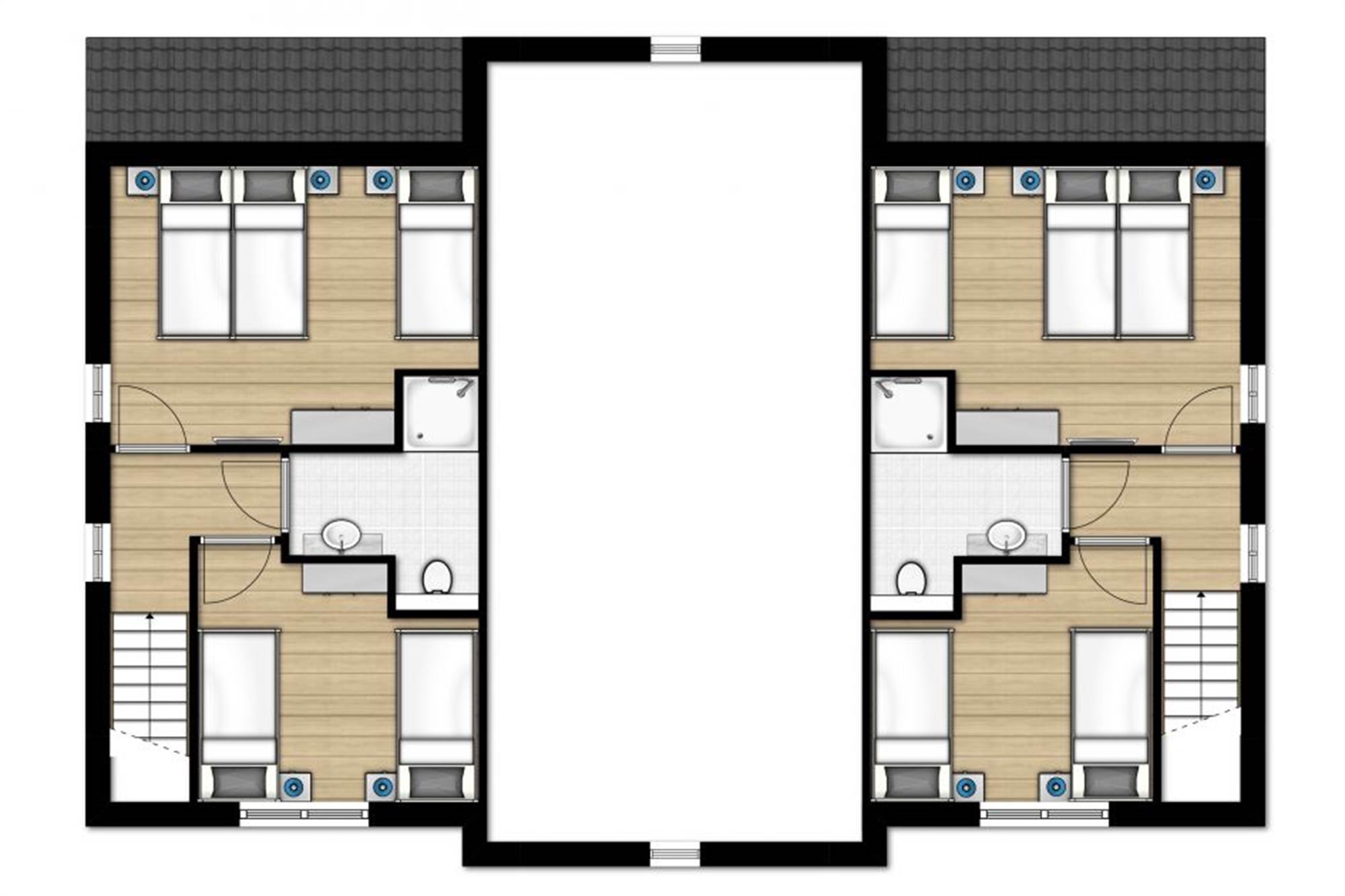 Ce bungalow indépendant de luxe à la résidence Klein Vink peut accueillir 5 personnes et fait partie d'un logement 3-sous un même toit. Le type KVR5 est situé soit sur la gauche soit sur la droite. Pars le biais d’une entrée centrale commune vous arriverez à votre couloir privé, donnant accès à la salle de séjour lumineuse avec portes françaises donnant sur la terrasse. La cuisine est équipée d'appareils de luxe, dont un lave-vaisselle. À l'étage se trouvent une chambre avec deux lits simples et une chambre avec trois lits simples. Il y a une salle de bains avec douche et toilettes. Au rez-de-chaussée se trouvent les toilettes séparées. Vous pouvez utiliser la connexion Wifi gratuitement.
