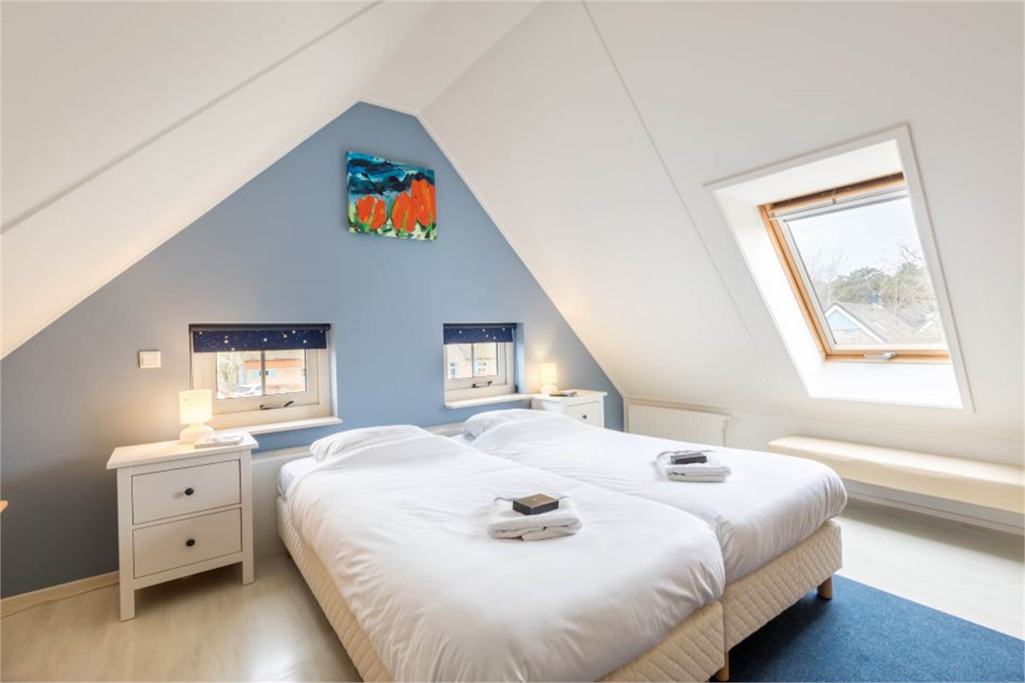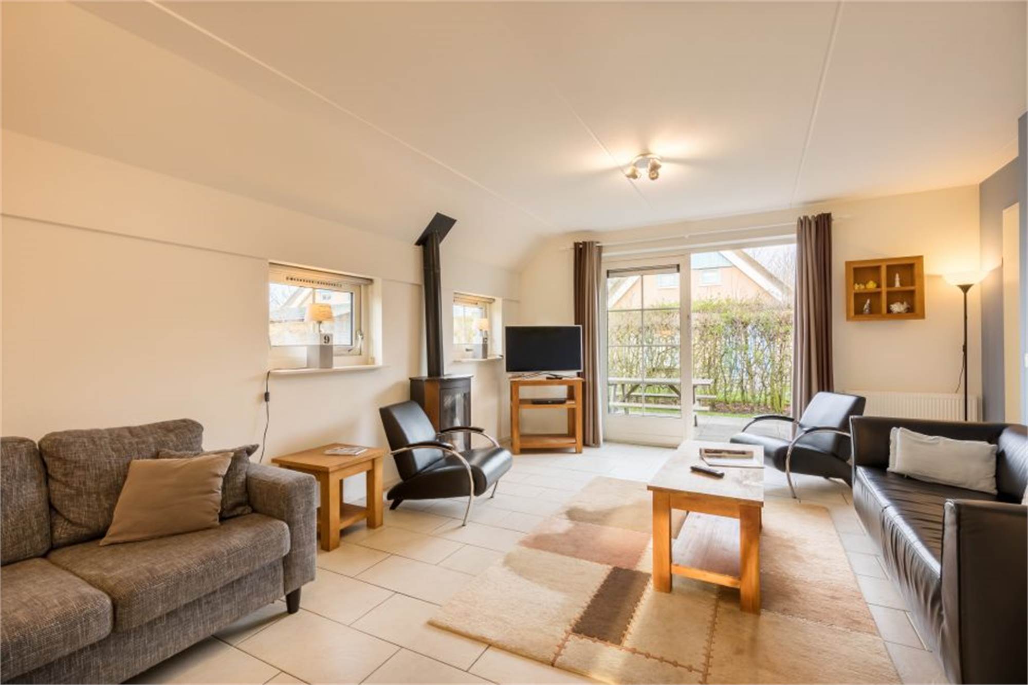 Ce bungalow indépendant peut accueillir 4 adultes et 2 enfants maximum. Au rez-de-chaussée se trouvent la salle de séjour et la cuisine. La cuisine est notamment équipée d’un micro-ondes combiné, d’un lave-vaisselle et d’une cafetière à dosettes. La salle de bain dispose d’une cabine de douche et il y a un W.C. Au premier étage se trouvent 2 chambres à coucher et un lit-clos. Les deux chambres à coucher sont munies de 2 lits simples à sommet tapissier. séparé dans le bungalow Il y a aussi une machine à laver. Le bungalow dispose d'un jardin avec terrasse et d’un mobilier de jardin pour s’y détendre.