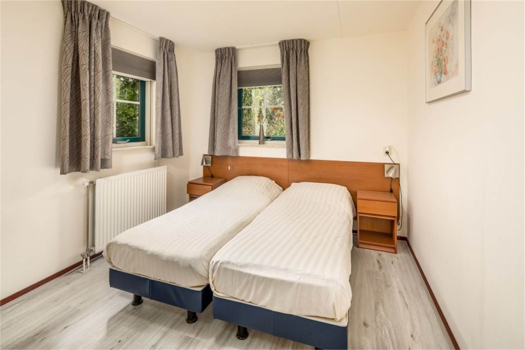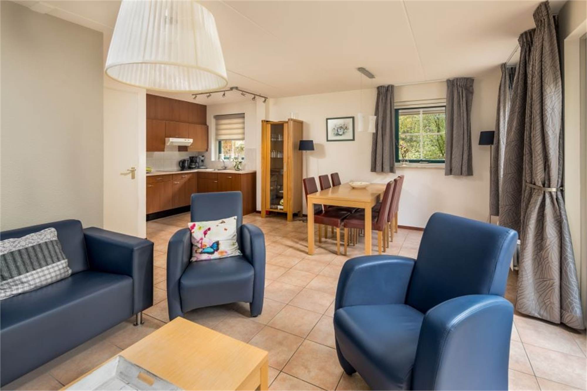 Aménagement : séjour avec cuisine ouverte et portes-fenêtres menant à la terrasse meublée. Toilettes séparées ou toilettes dans la salle de bains. Trois chambres, chacune avec deux couchages, une chambre est située au rez-de-chaussée. Vous disposez de deux salles de bains. Certains bungalows disposent d'un sauna (infrarouge) (voir supplément).