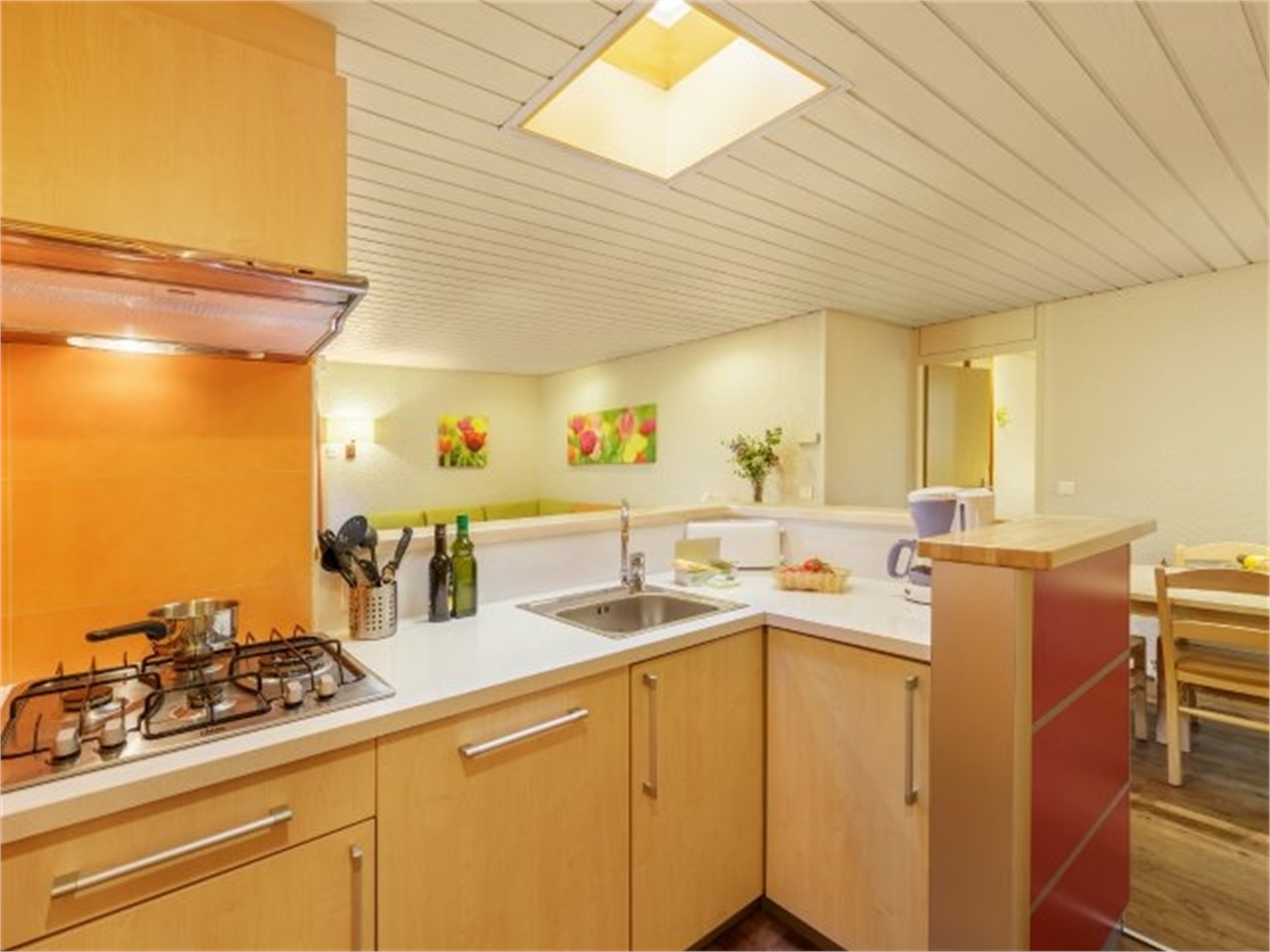 Cuisine aménagée à l'américaine, entièrement équipée : vaisselle, micro-ondes gril, réfrigérateur, Cafetière à filtre, lave-vaisselle