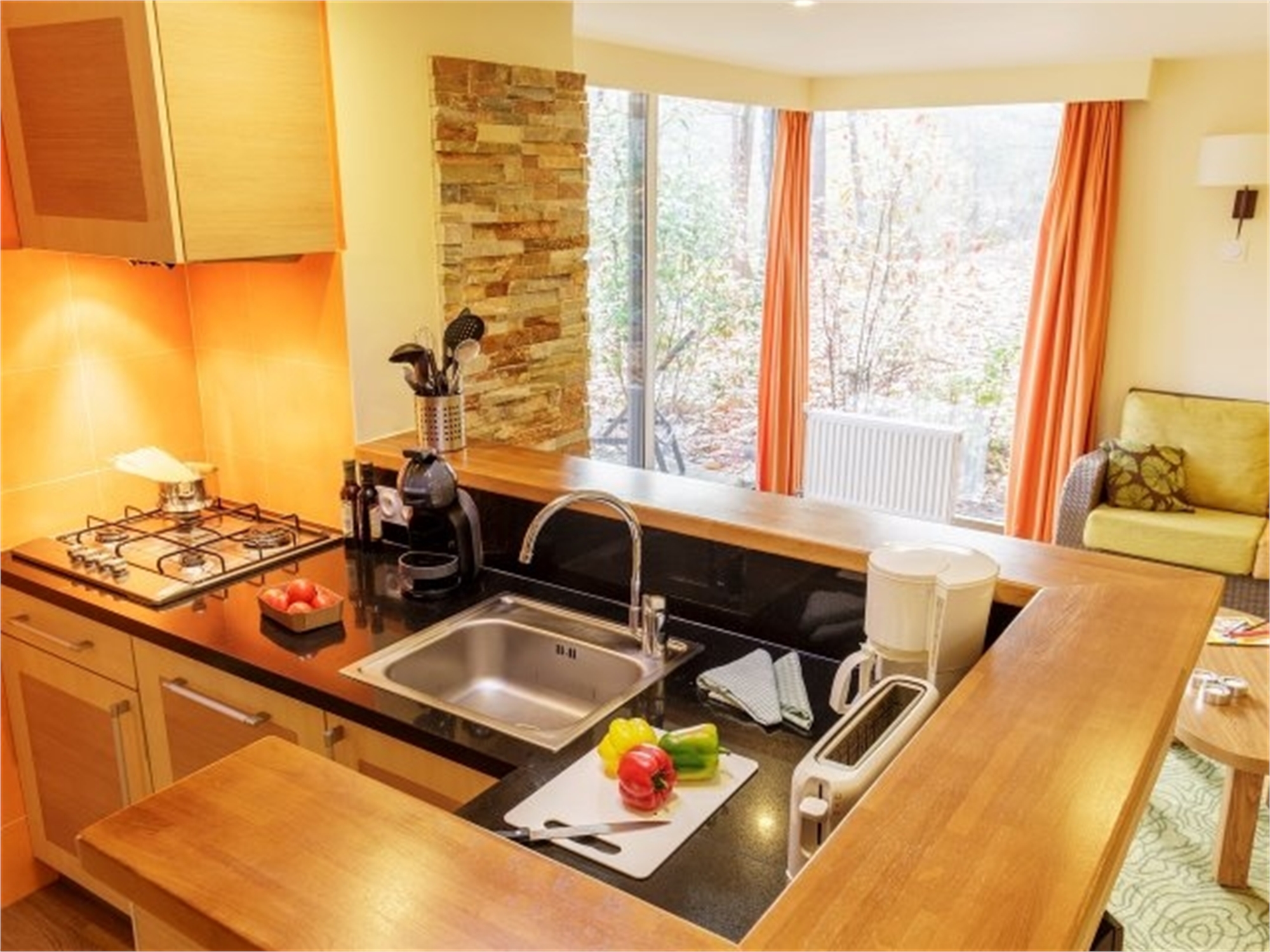 Cuisine aménagée à l'américaine, entièrement équipée : vaisselle, micro-ondes grill, plaque de cuisson, hotte aspirante, réfrigérateur, lave-vaisselle, cafetière électrique, bouilloire électrique, grille-pain, NESCAFÉ Dolce Gusto