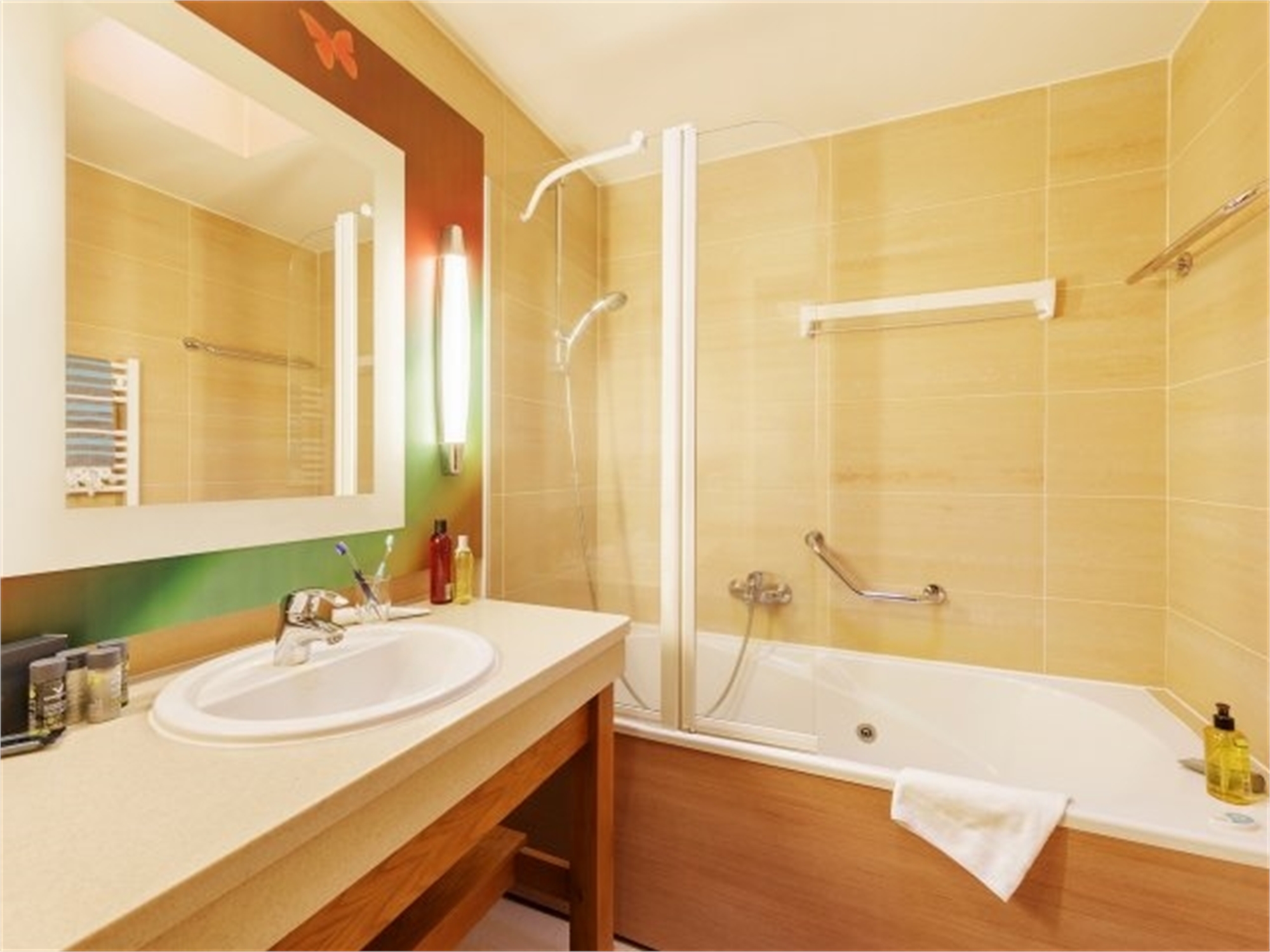 Salle de bains avec baignoire à remous, lavabo en vasque, sèche-cheveux