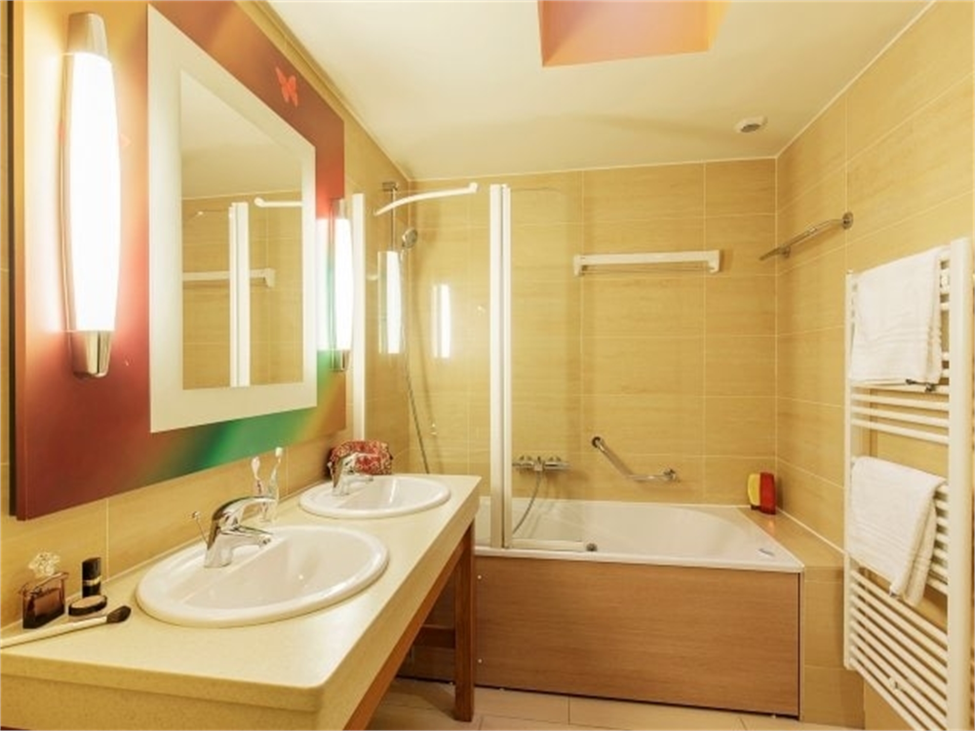 2 salles de bains : 1 avec baignoire à remous, lavabo double vasque, sèche-cheveux, 1 avec douche et lavabo