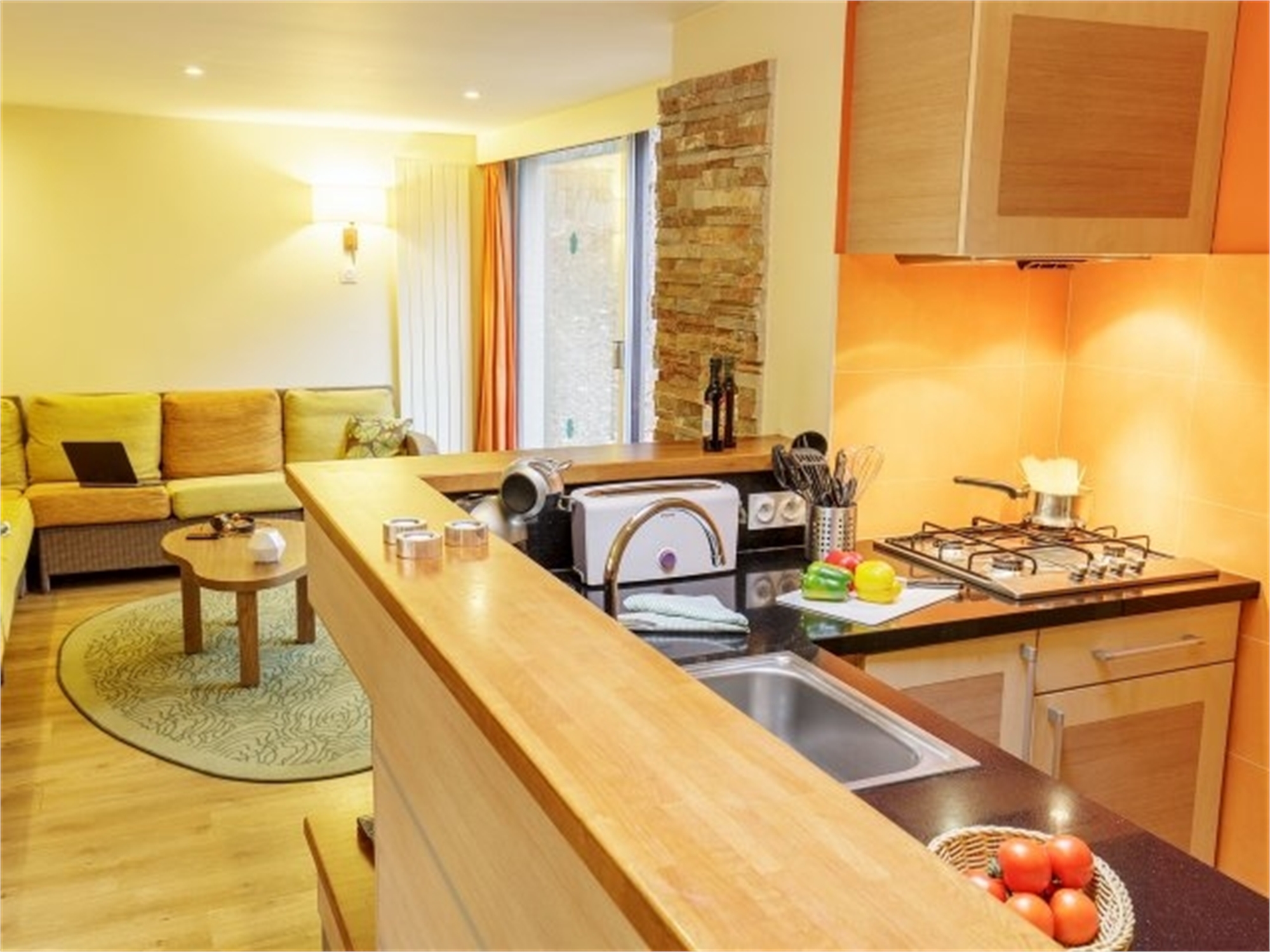 Cuisine aménagée à l'américaine, entièrement équipée : vaisselle, micro-ondes grill, plaque de cuisson, hotte aspirante, réfrigérateur, lave-vaisselle, cafetière électrique, bouilloire électrique, grille-pain, NESCAFÉ Dolce Gusto