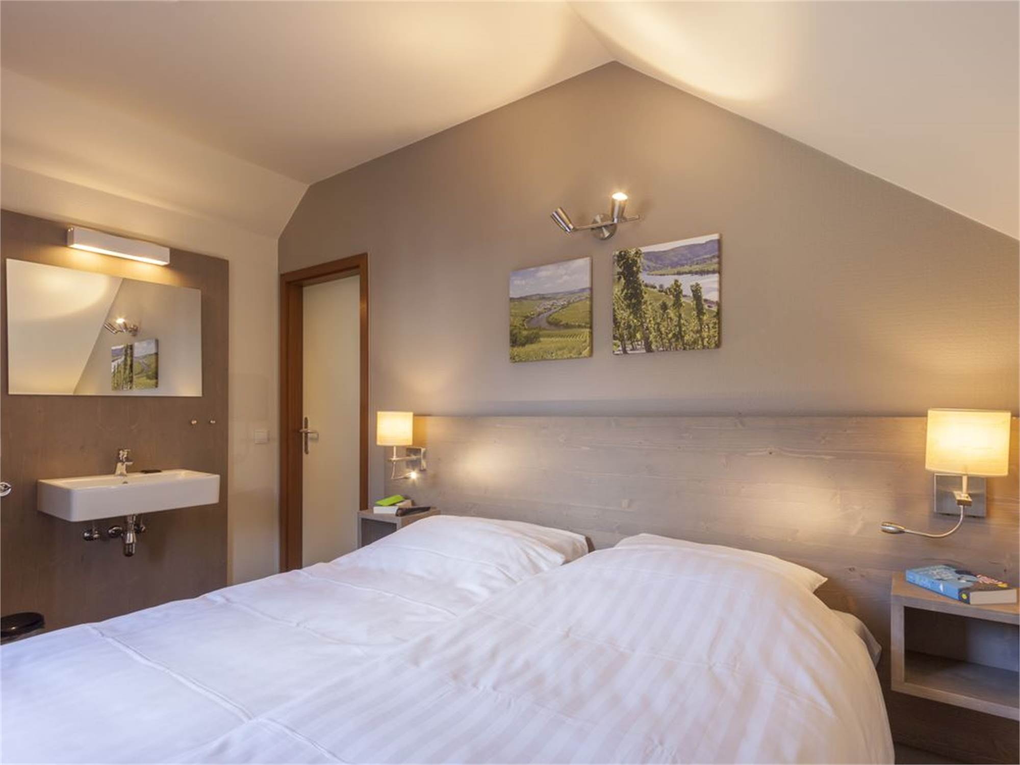 Chambre à coucher avec deux lits boxspring pour 1 personne, surmatelas et téléviseur