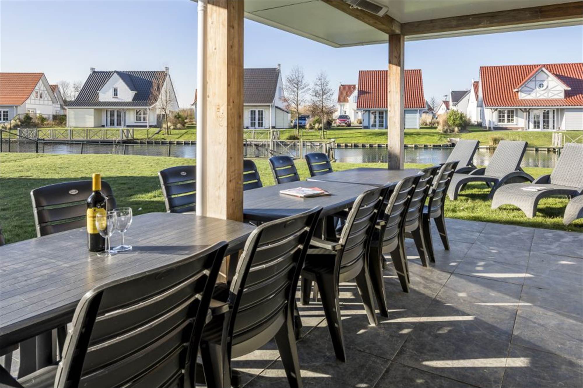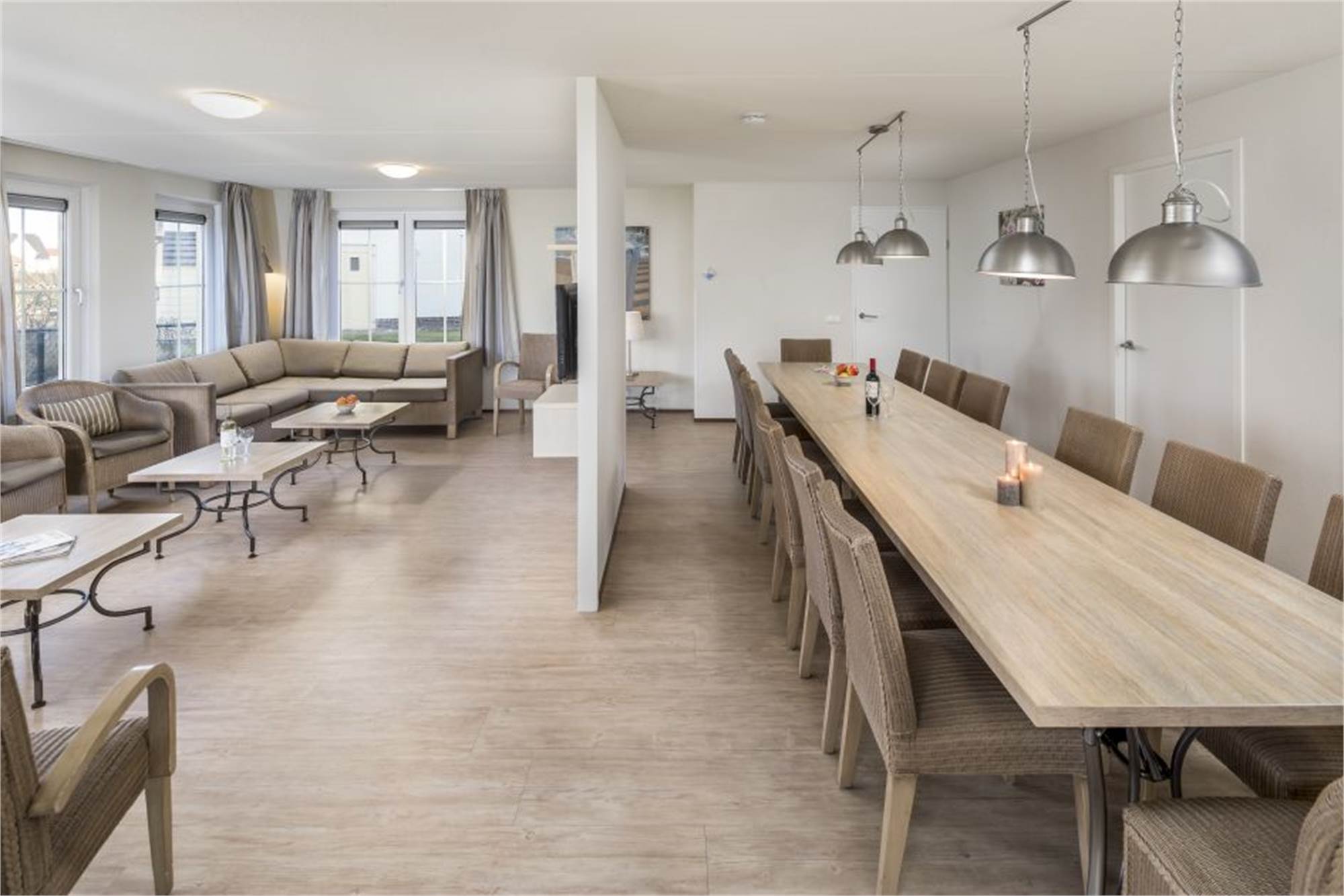 Cette villa familiale individuelle peut accueillir 16 personnes. Par le biais du hall vous entrez dans le salon lumineux avec chauffage au sol et portes françaises donnant sur la terrasse couverte. Il y a une cuisine entièrement équipée avec lave-vaisselle, micro-ondes combiné et un réfrigérateur / congélateur, un WC au rez-de-chaussée, un débarras, ainsi que deux chambres luxueuses avec une salle de bains avec douche et toilettes. Au premier étage se trouvent cinq chambres, une salle de bains avec douche, une salle de bains avec douche et sauna infrarouge, une salle de bains avec baignoire et deux toilettes séparées. Si vous apporter vos vélos en vacances, vous pouvez les stocker dans la remise extérieure.