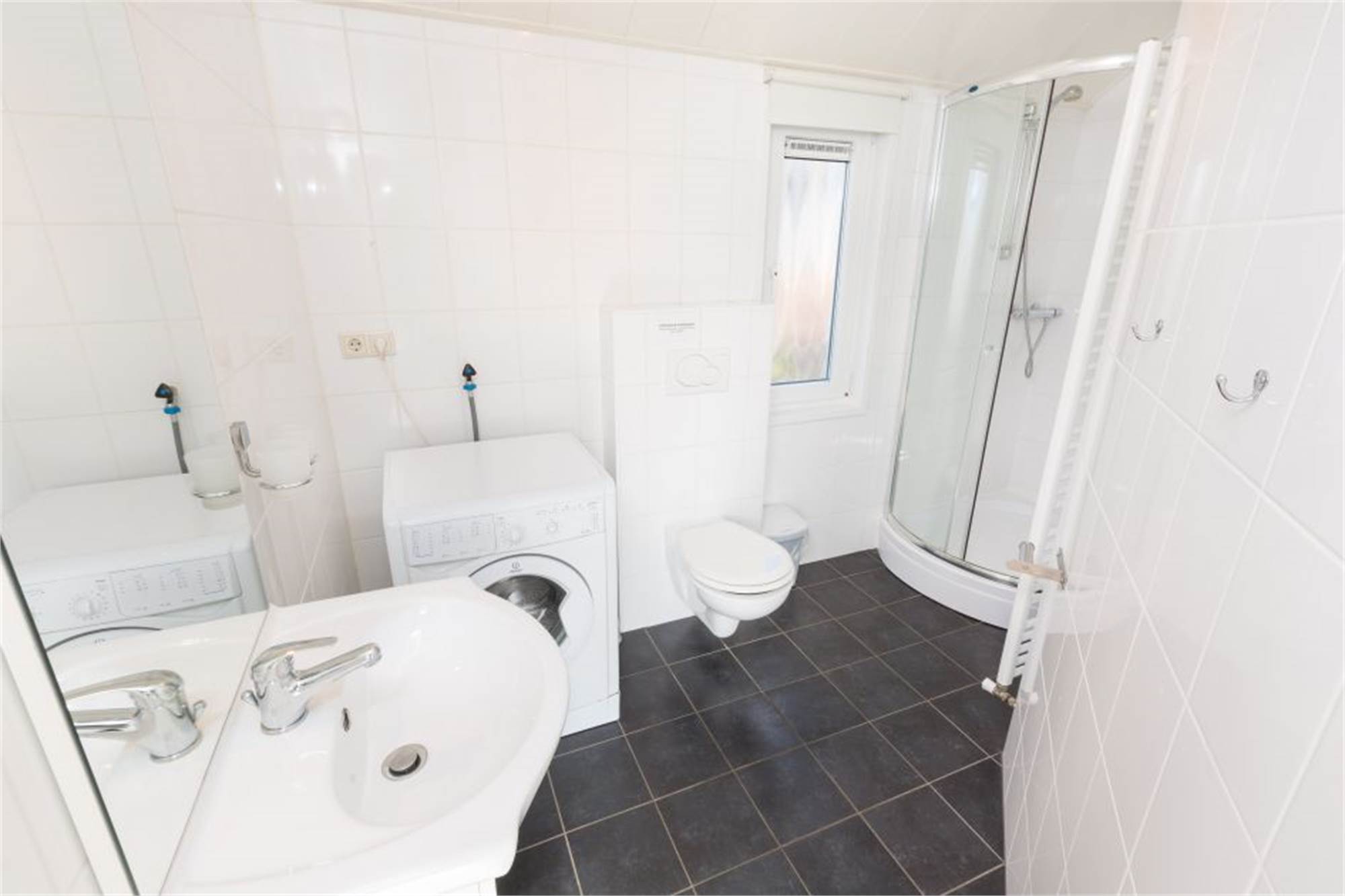 Trois chambres, deux avec deux lits simples et l'autre avec un lit superposé. Salle de bains luxueuse avec WC et cabine de douche, machine à laver et rangements.