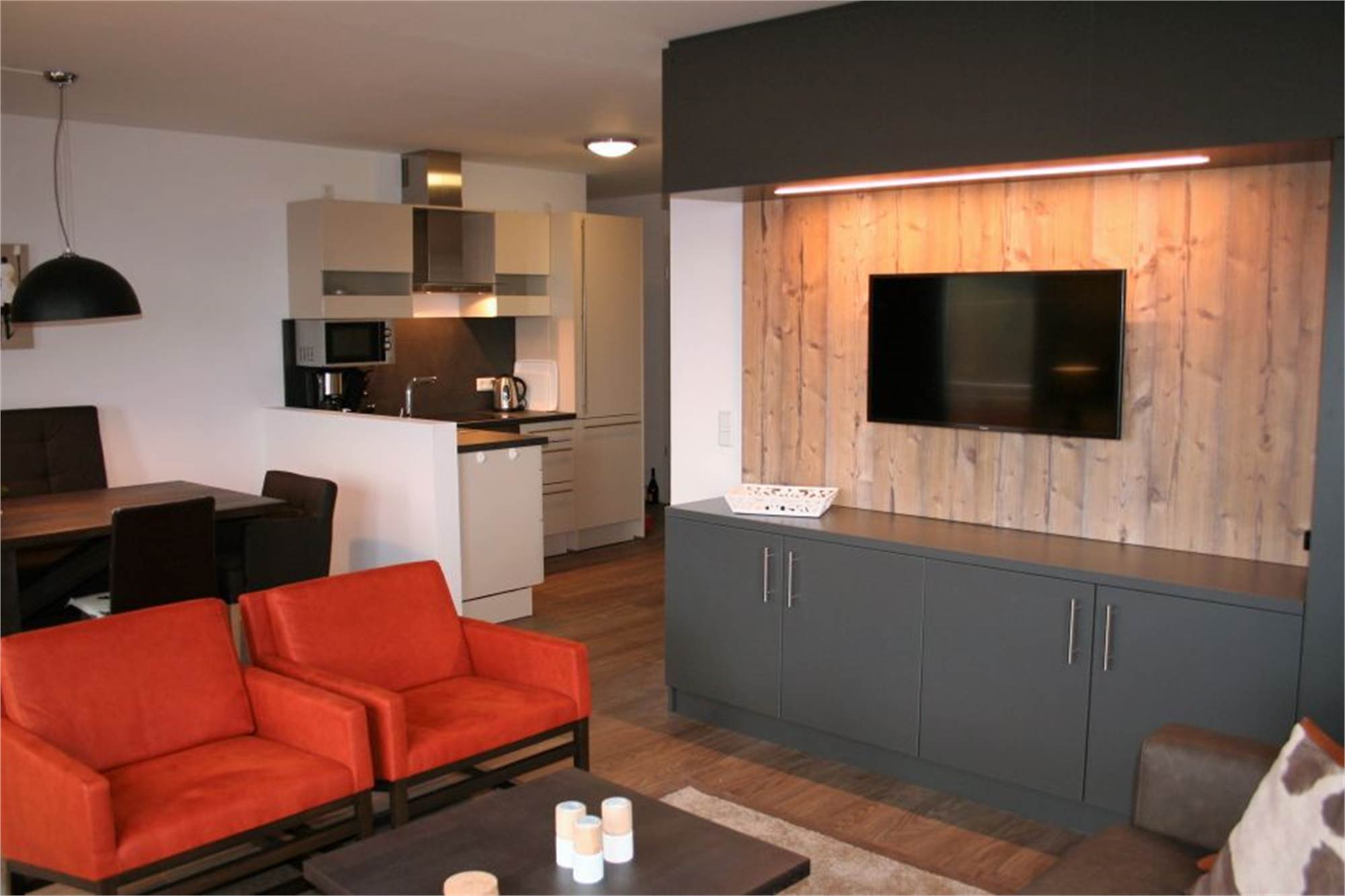 Cet appartement est très spacieux avec 2 étages et il convient pour 4 à 6 * 6 à 8 personnes. Au rez-de-chaussée il y a un séjour moderne avec un coin salon chaleureux et un canapé-lit pour deux personnes. La cuisine est équipée d’une grande table, un lave-vaisselle, un micro-ondes et un four. En plus, il y a 3 chambres, chacune avec deux lits sommiers tapissiers. Une chambre dispose d’une télévision et une salle de bains en suite. Les 2 salles de bains disposent toutes les deux d’une douche à l'italienne et des toilettes. L’appartement a aussi un balcon et le WiFi y est gratuit. Il y a un parking pour une voiture.