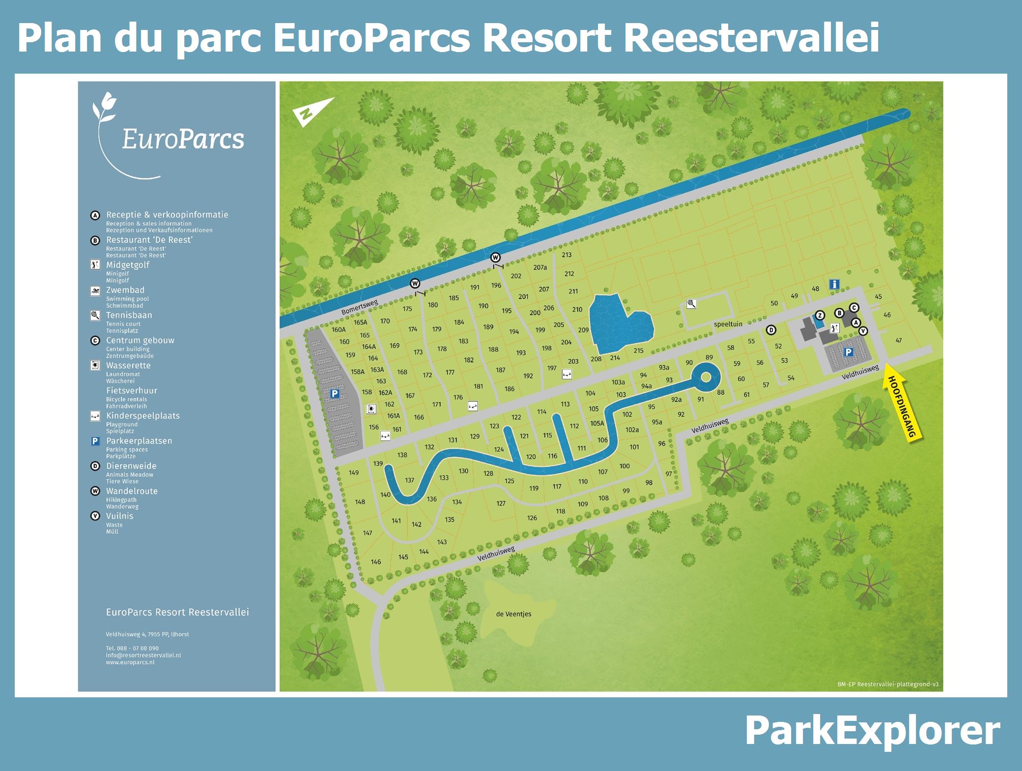 Le plan actuel du EuroParcs Reestervallei avec tous les hébergements et installations, est aussi disponible en pdf.
