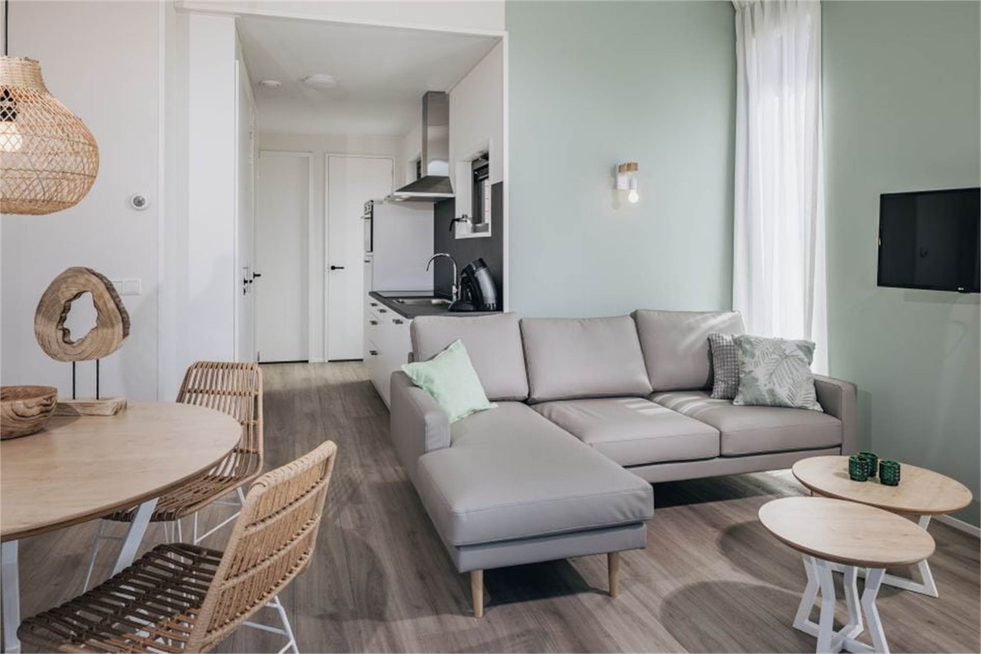 Ce lodge indépendant de plain-pied pour 4 personnes dispose d'un salon spacieux avec un coin salon, une télévision connectée et un coin repas. La cuisine ouverte est entièrement équipée avec une machine à café et une bouilloire. Il y a 2 chambres à coucher, 1 avec 2 lits simples et 1 chambre à coucher avec un lit superposé. La salle de bains dispose d'une douche et de toilettes séparées. Le lodge possède également une terrasse couverte que vous pouvez entrer par les portes-fenêtres. Vous pouvez utiliser les meubles de jardin confortables. Vous pouvez vous garer sur le parking central.