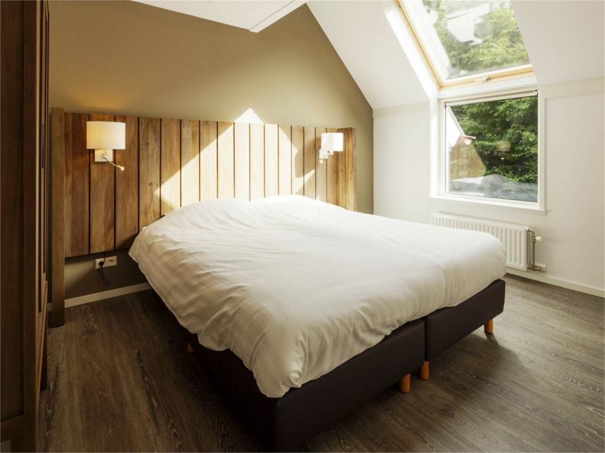 Quatre chambres à coucher avec deux boxsprings Auping 1 personne, couvre-matelas softtoper et tv