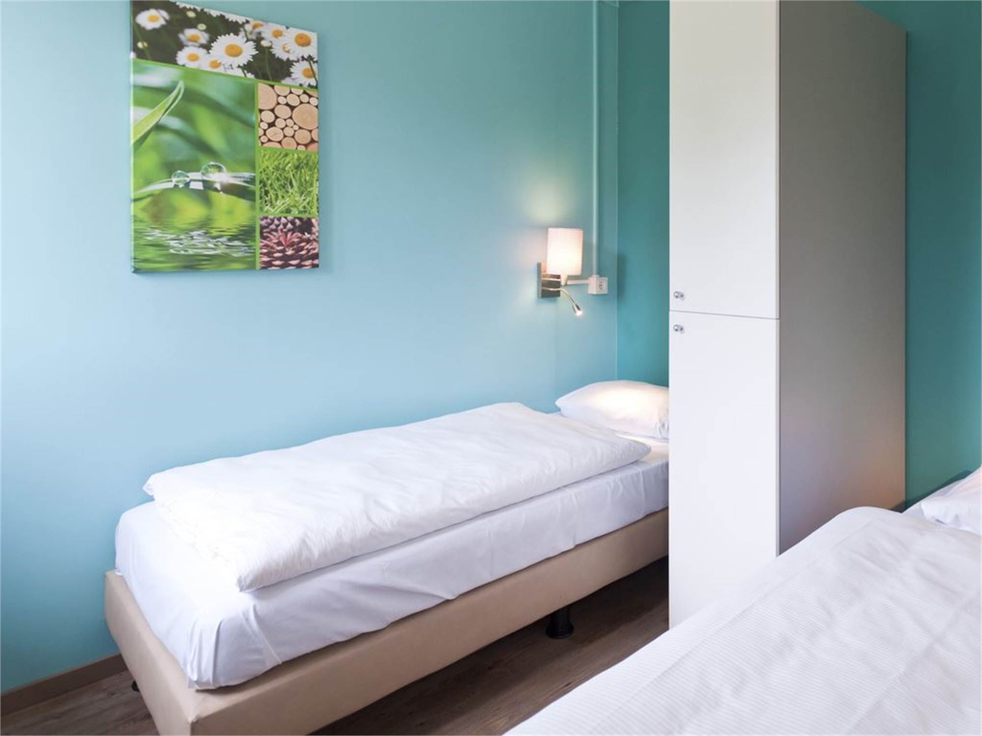 Chambre à coucher avec deux lits boxspring pour 1 personne, surmatelas pour 2 personnes, lavabo et téléviseur à écran plat