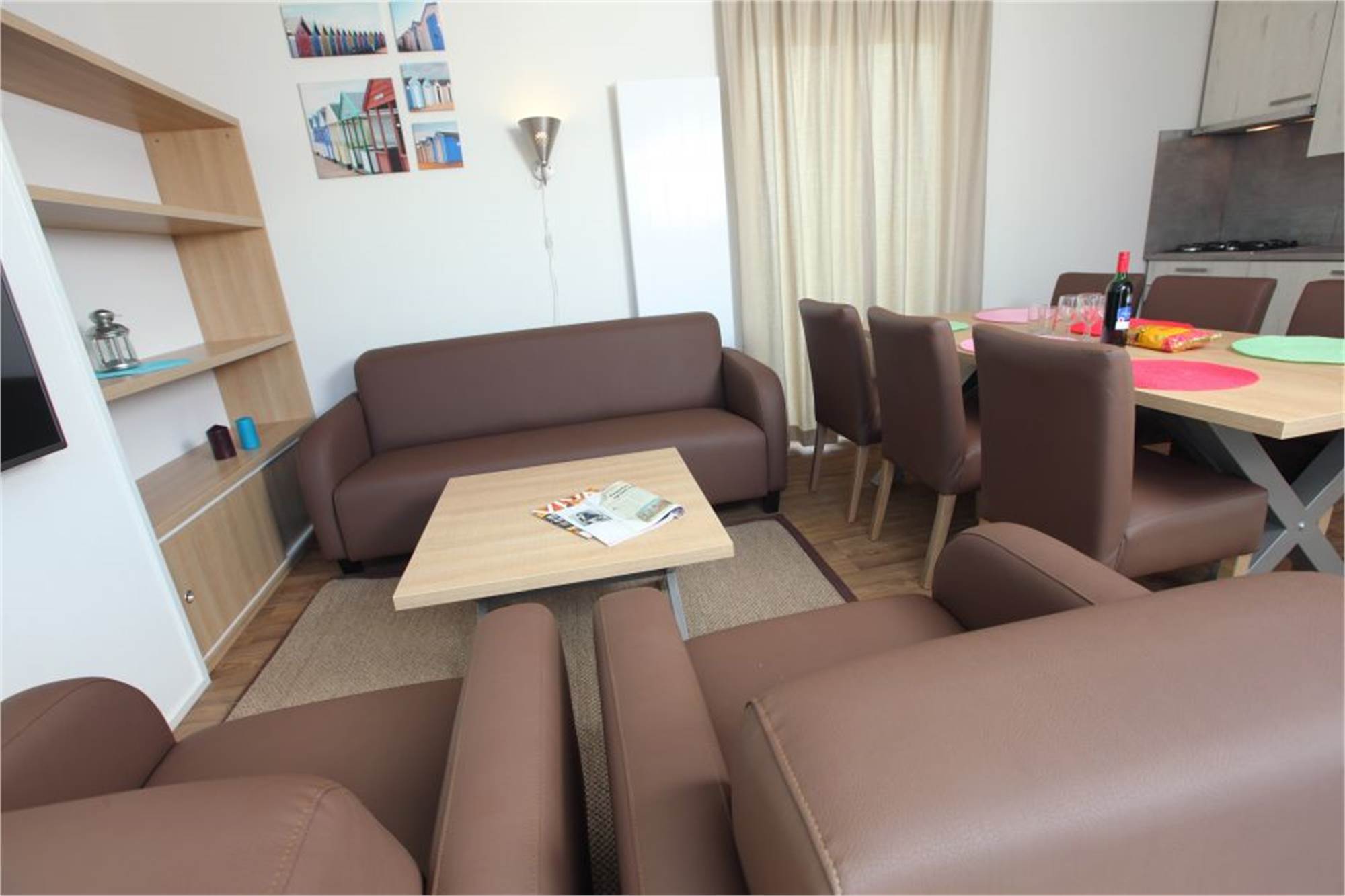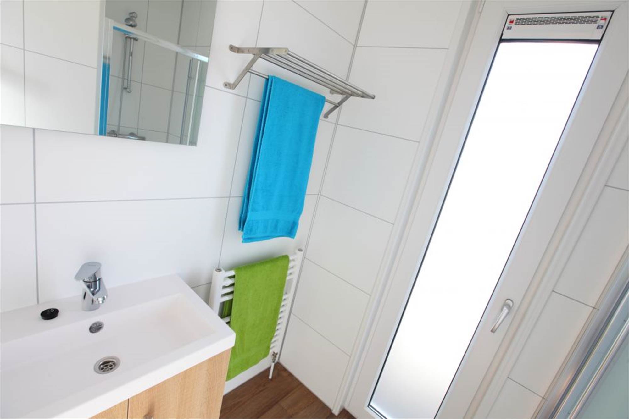 Ce lodge individuel construit de plain-pied peut accueillir 6 personnes. Dans le salon avec smart TV, vous trouverez un coin salle à manger séparé et la cuisine est équipée, entre autres, d'un lave-vaisselle, d'un micro-ondes combiné et d'une machine à café à dosettes. Le lodge dispose de 3 chambres, 2 sont meublées de 2 lits simples avec sommiers à ressorts et 1 chambre est équipée de lits superposés. Il y a également une salle de bains avec douche et toilettes. L'utilisation du Wifi est gratuite et le lodge dispose d'une place de stationnement pour une voiture. Certains lodges sont luxueusement équipés avec une machine à laver, un sèche-linge, une télévision dans la chambre à coucher, un ensemble de salon et des chaises longues. Ces lodges peuvent être réservés de préférence.