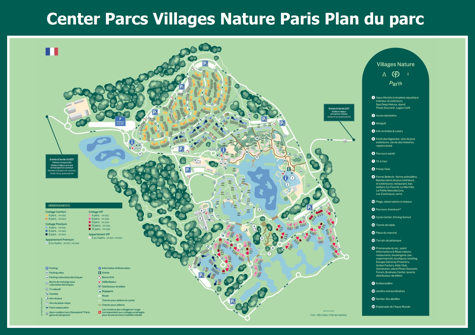 Le plan actuel du Center Parcs Villages Nature Paris avec tous les hébergements et installations, est aussi disponible en pdf.